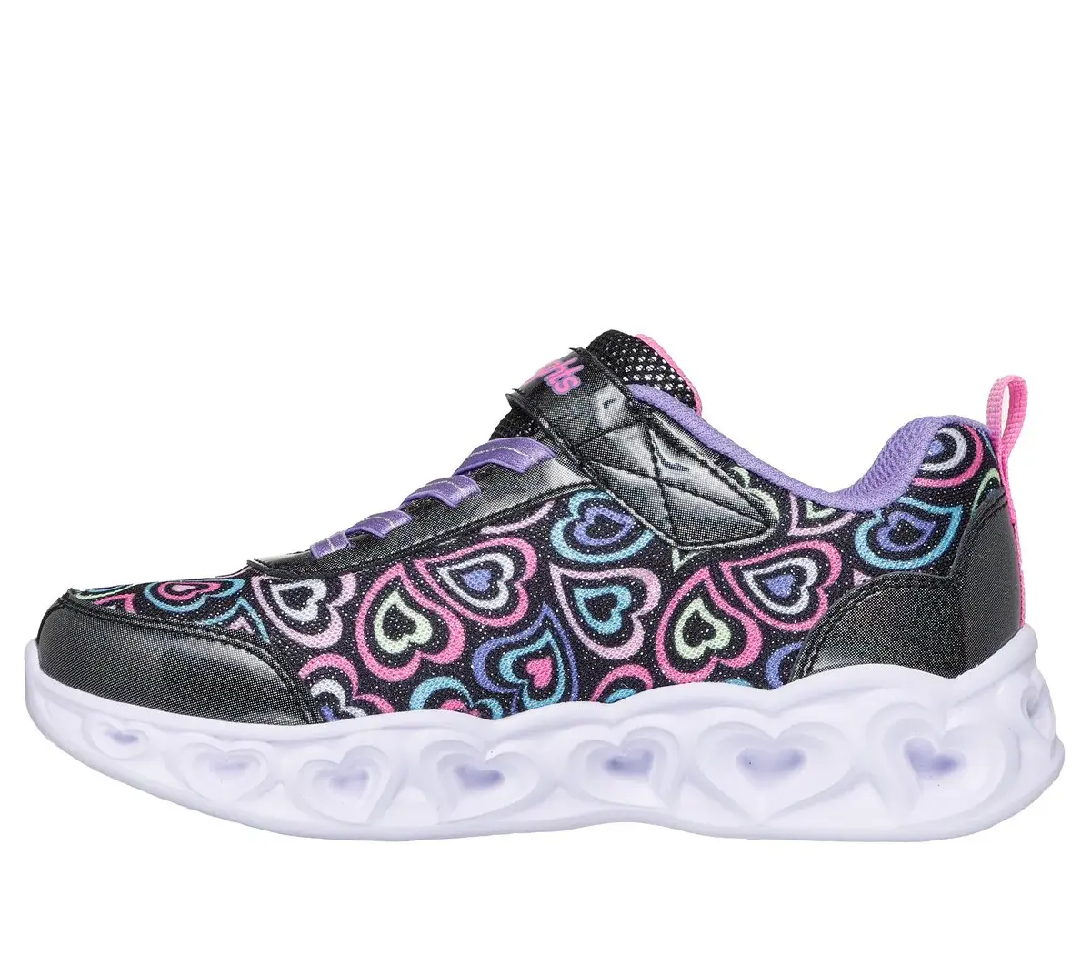 Delight them with the twinkling fun of Skechers Heart Lights – Boogie Love. This colorful sneaker features a sparkly, heart-printed synthetic upper with fixed stretch laces and Adaptive Closure, plus a heart-sculpted light-up midsole.