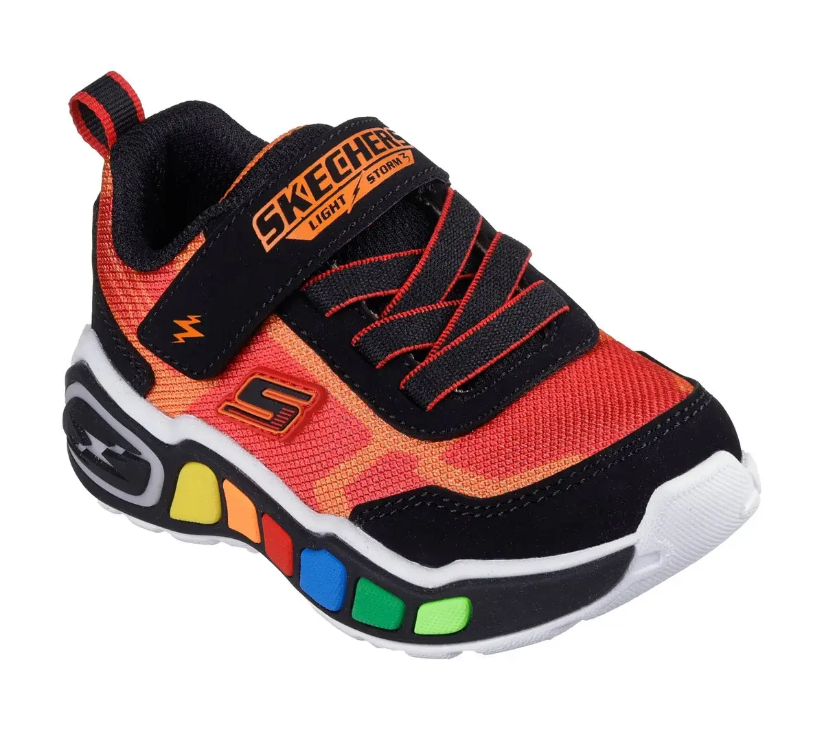 Be the fun in colorful light-up style wearing Skechers Play Scene – Storm Brights. This sporty light-up design features a mesh and synthetic upper with stretch laces, adjustable instep strap, cushioned comfort insole, and a multi-colored light-up midsole tech piece.