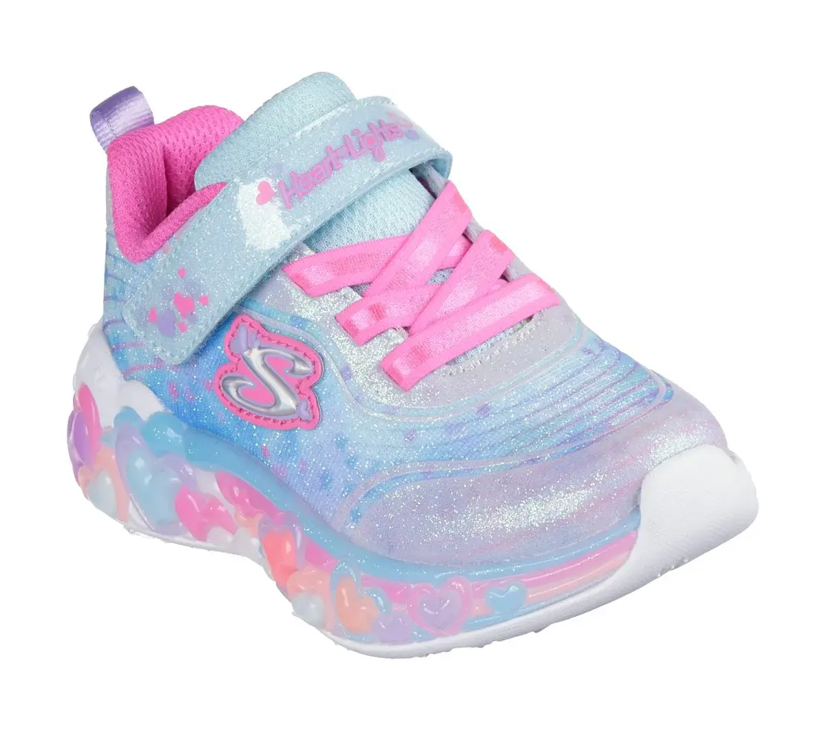 Sporty style gets lit-up and lovable with Skechers S-Lights®: Eternal Heart Lights. This lighted design features a sparkle mesh and synthetic glitter upper with stretch-laced front, and a Skechers adaptive closure.