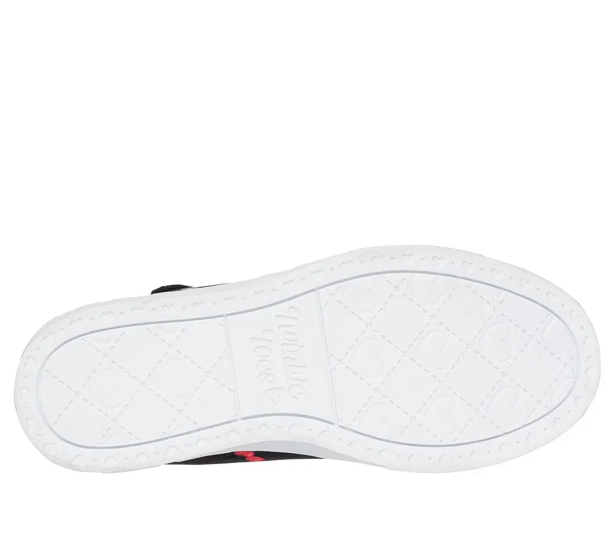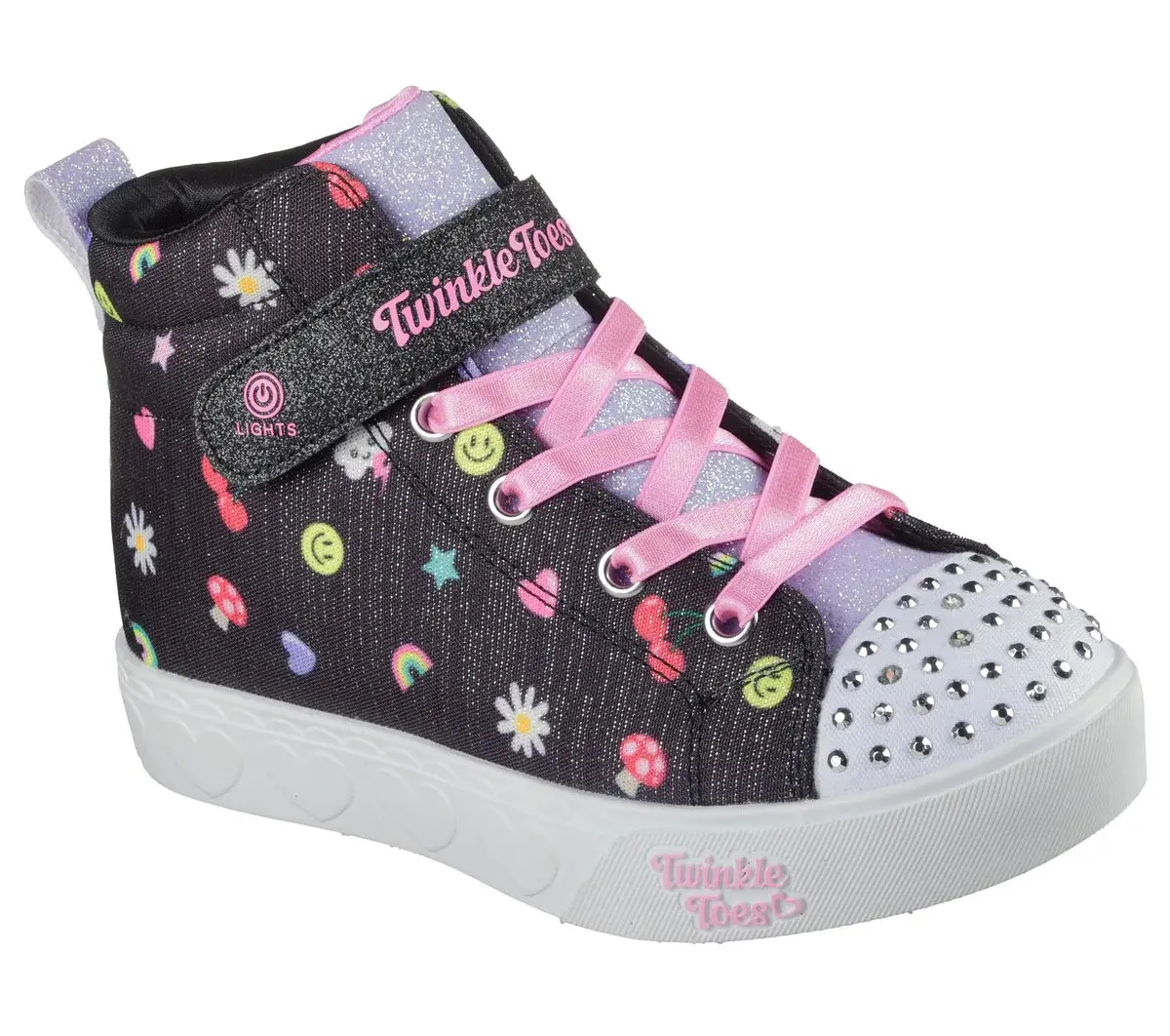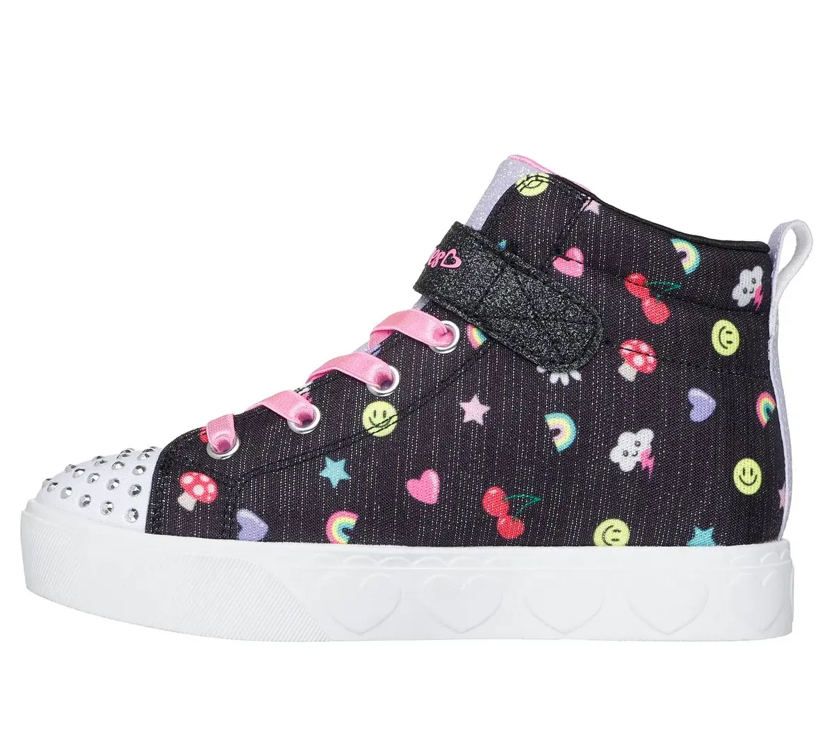 Light up every room with glittery style wearing Skechers Twinkle Toes®: Heart Steps – Icon Party. This high-top fashion sneaker features a glitter upper with a fun, micro print, stretch laces, an adjustable instep strap, and a light-up rhinestone-embellished toe cap.