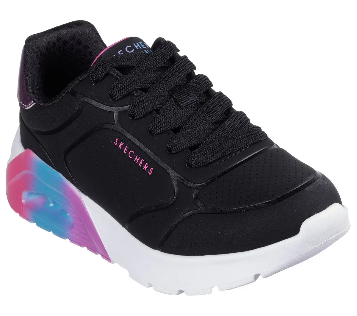Step up your style with Skechers Street™ Uno Lite 2.0 – Vivid Pop. This lightweight fashion lace-up features an embossed durabuck upper with metallic heel trim, a painted midsole with cutouts, and a Skechers Air-Cooled Memory Foam® comfort insole.