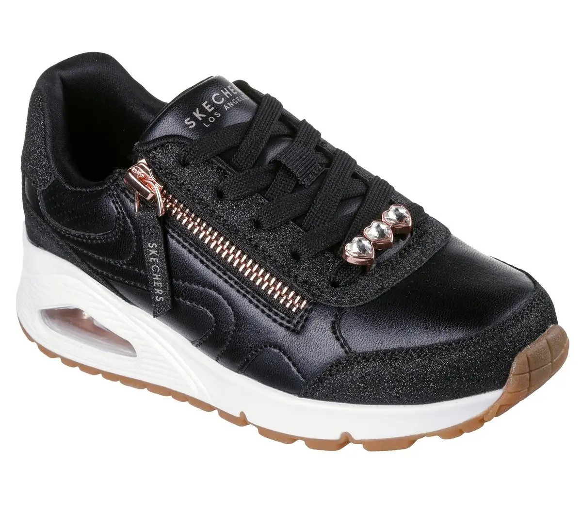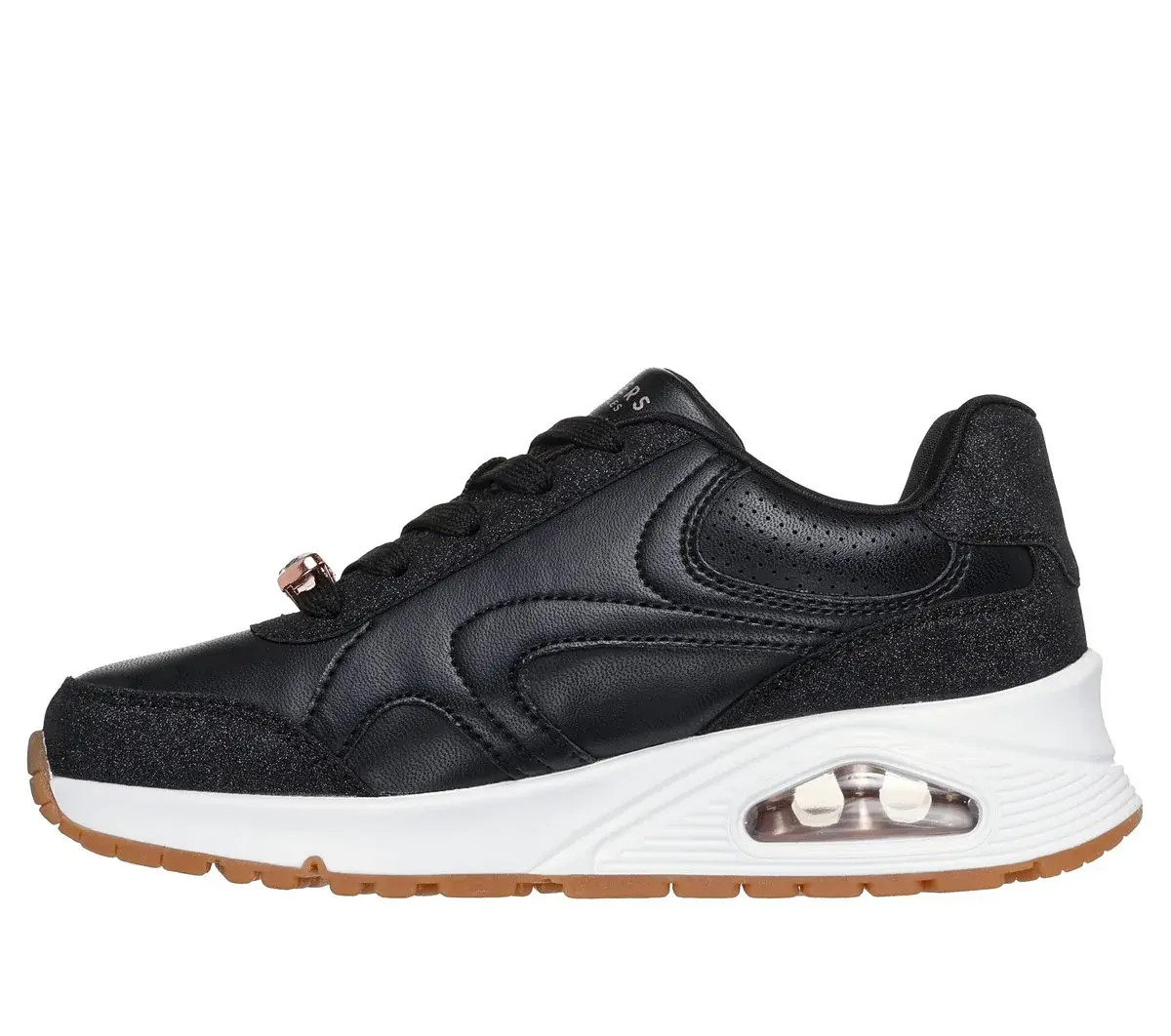 Sparkle with every cushioned step wearing Skechers Street™ Uno Gen1 – Gem Style. This lace-up Skechers adaptive closure design features a synthetic upper with glittery overlays, a quarter zip closure, a Skechers Air-Cooled Memory Foam® comfort insole, and a visible Skech-Air® airbag midsole.