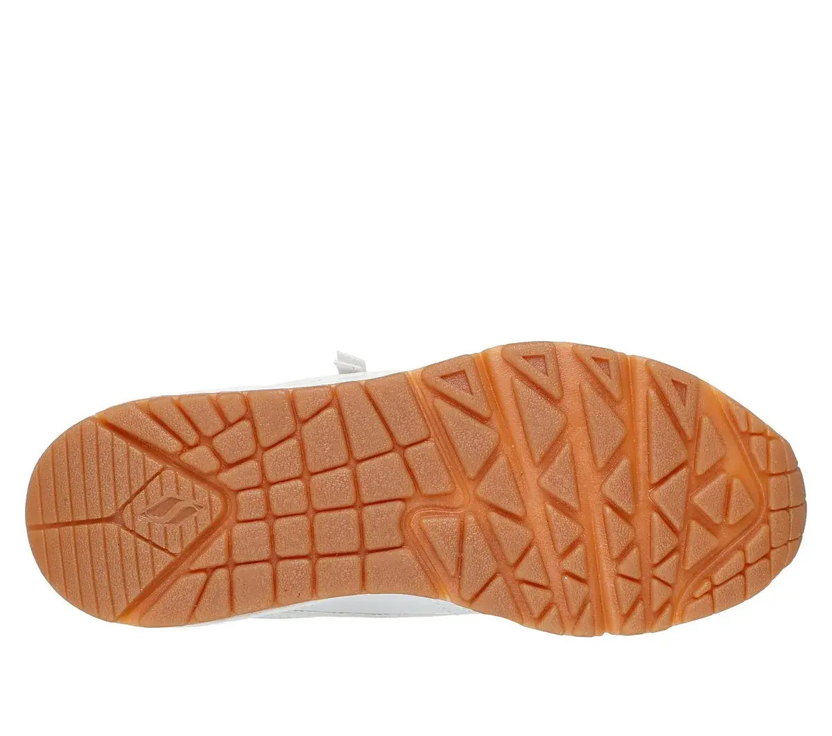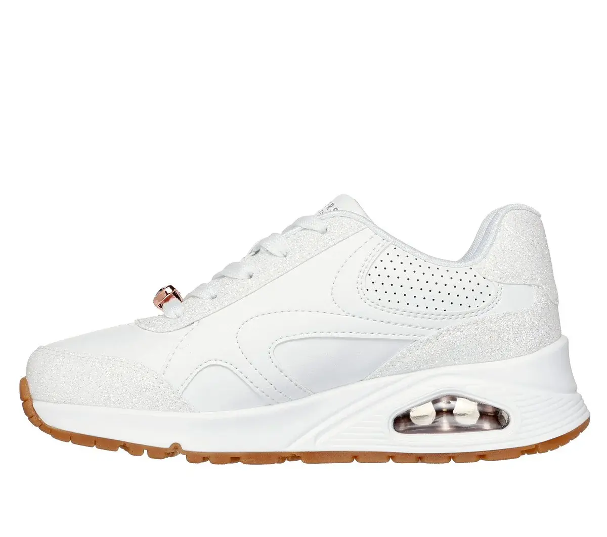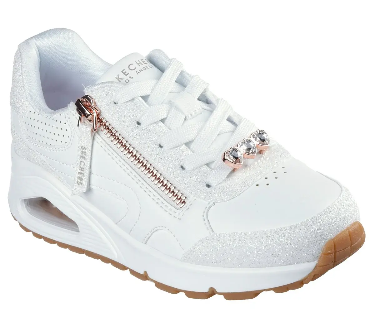 Sparkle with every cushioned step wearing Skechers Street™ Uno Gen1 – Gem Style. This lace-up Skechers adaptive closure design features a synthetic upper with glittery overlays, a quarter zip closure, a Skechers Air-Cooled Memory Foam® comfort insole, and a visible Skech-Air® airbag midsole.