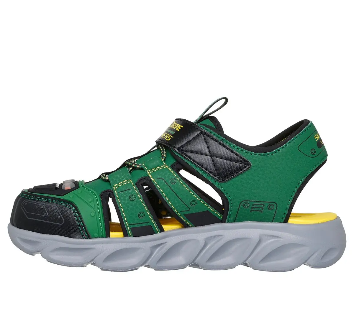Get ready for sunny-weather adventures wearing Skechers Foamies® x John Deere: Hypno-Splash. This lighted fisherman sandal features a synthetic upper with a tractor themed design and matching charm, Skechers adaptive closure, and a contoured cushioned footbed.