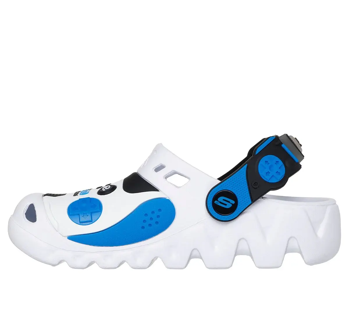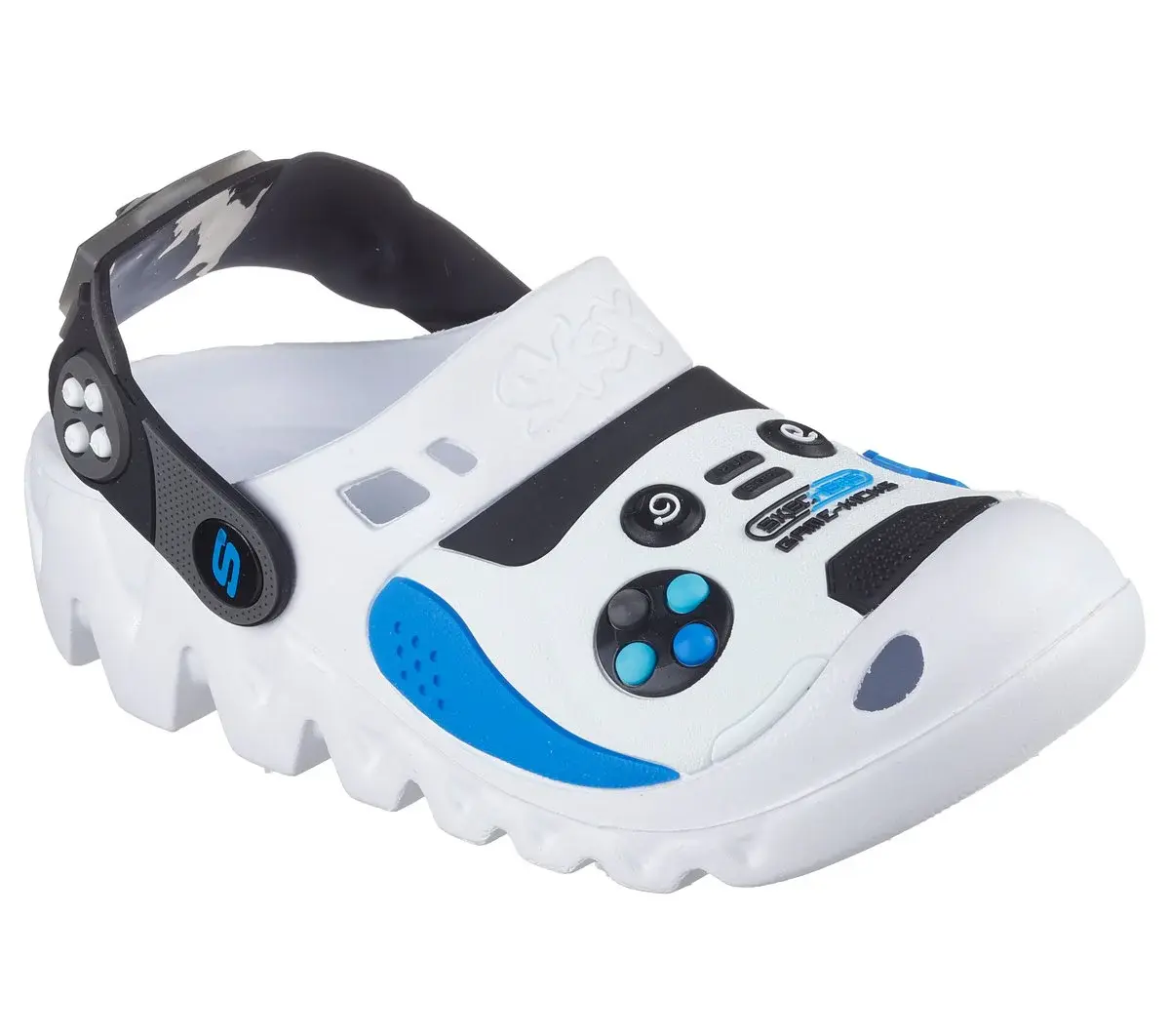 Step up the fun in awesome comfort with Skechers Foamies® Game Kicks®: Zaggle – Hydro-Pointz. This comfort clog style features a flexible an EVA upper with a game controller themed design, convertible heel strap, lighted details and a contoured cushioned footbed.