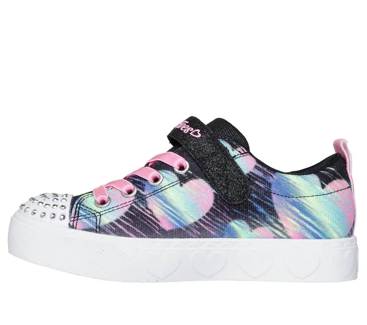 Light up every room with artful style wearing Skechers Twinkle Toes®: Heart Steps – Heart Sketch. This heart-trimmed design features a shimmer fabric upper with ‘heart sketch’ print, stretch laces, adjustable instep strap, and a light-up rhinestone-embellished toe cap.