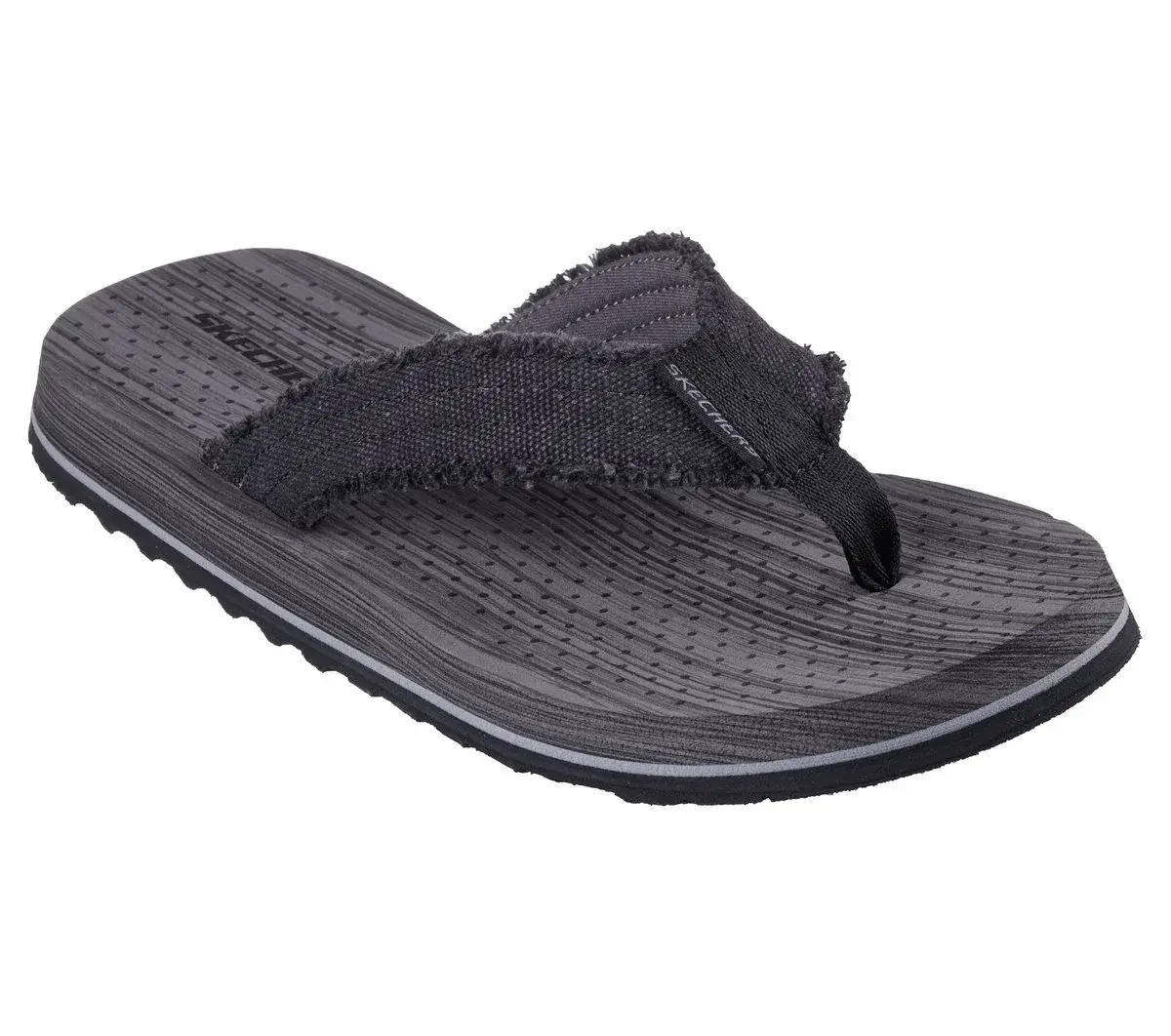 Bring on the sand, surf, and sun in Skechers Tantric – Fritz. This casual 3-point thong sandal features a frayed canvas upper with a faux woodgrain and sports stripe detailed midsole.
