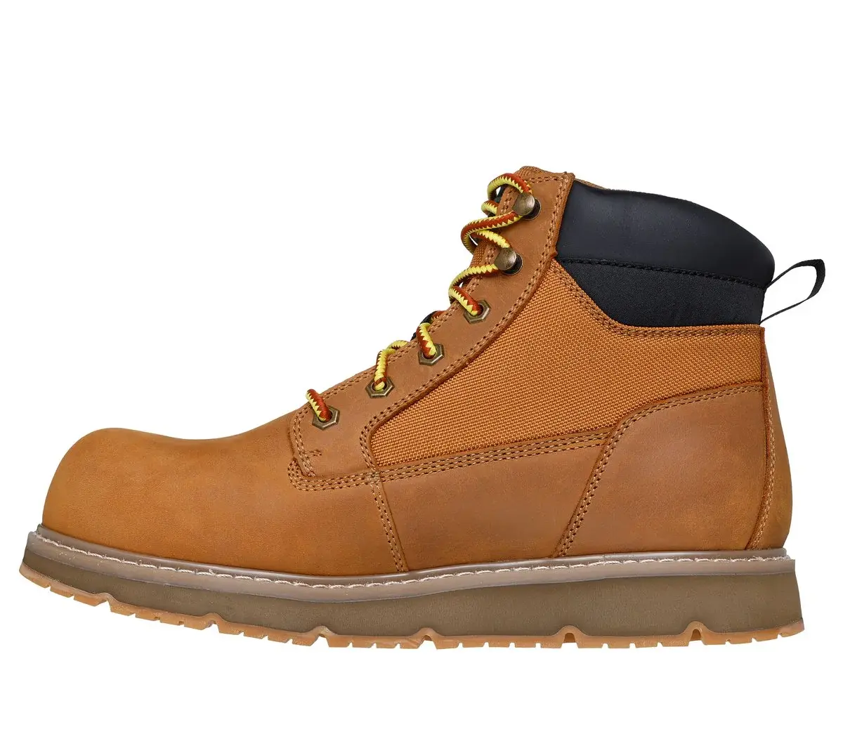 Get the most out of your work footwear with Skechers x John Deere: Flex-Wedge Ranger – Hollow Rapids. This waterproof safety boot features a lace-up leather and Oxford nylon upper with a padded collar, non-metallic composite safety toe, lightweight EVA midsole cushioning, and a slip-resistant Goodyear® rubber outsole.