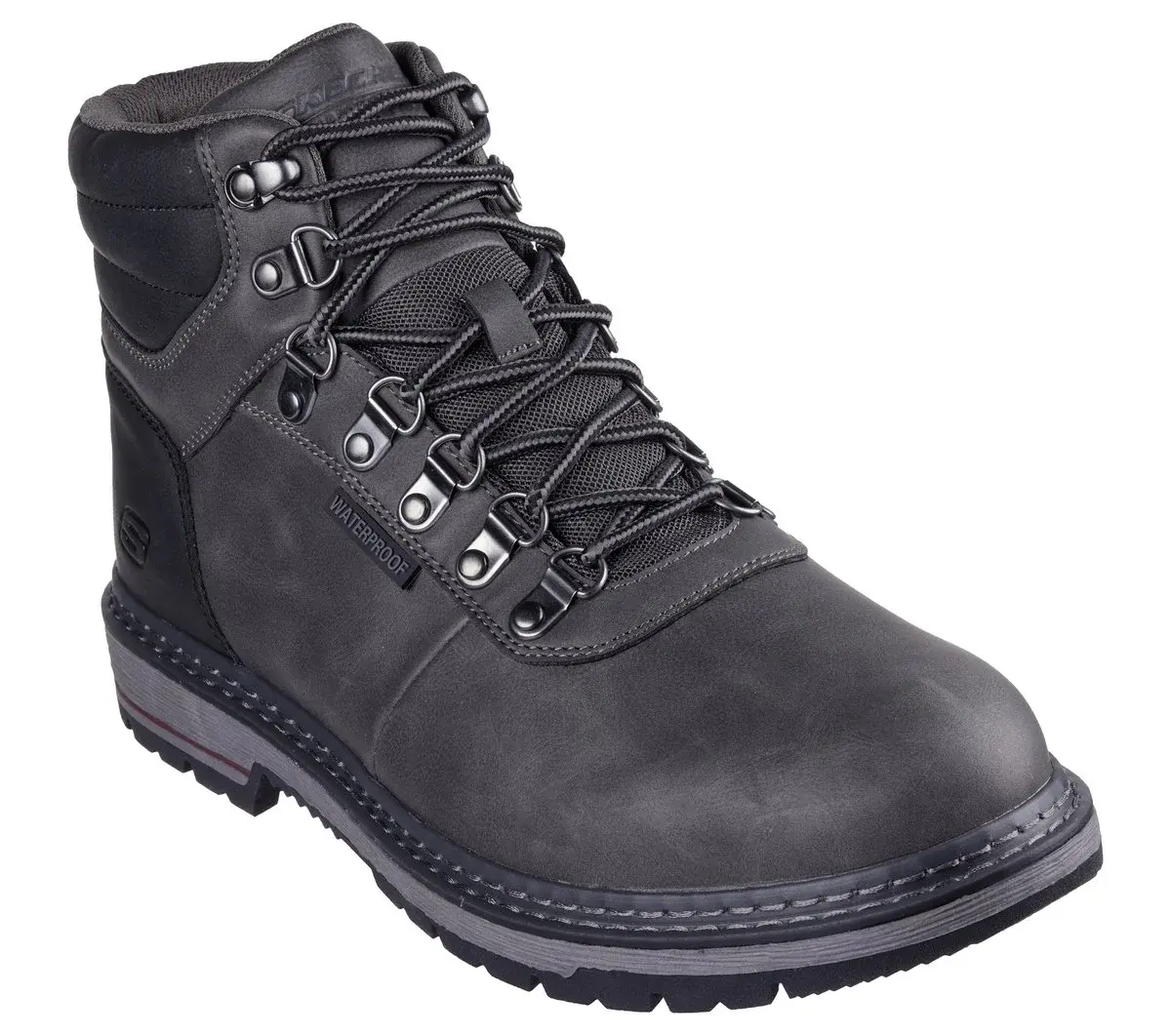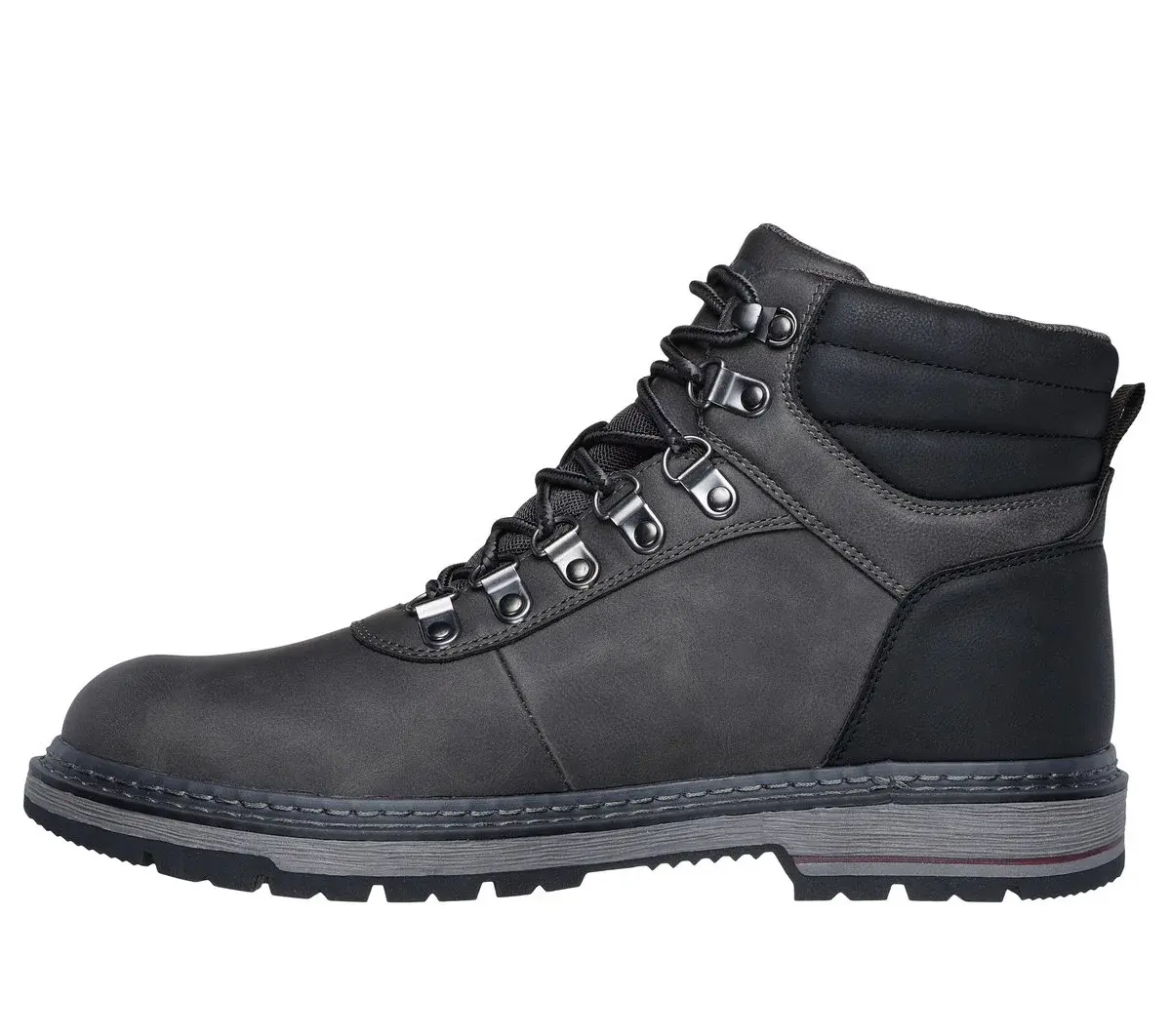 Head outdoors rain or shine wearing Skechers Relaxed Fit®: Corado – Jaxx. This classic trail-style boot features a smooth, waterproof faux-leather upper with padded collar, a charcoal-infused Skechers Air-Cooled Memory Foam® insole, and Goga Mat Arch™ cushioning for added support.