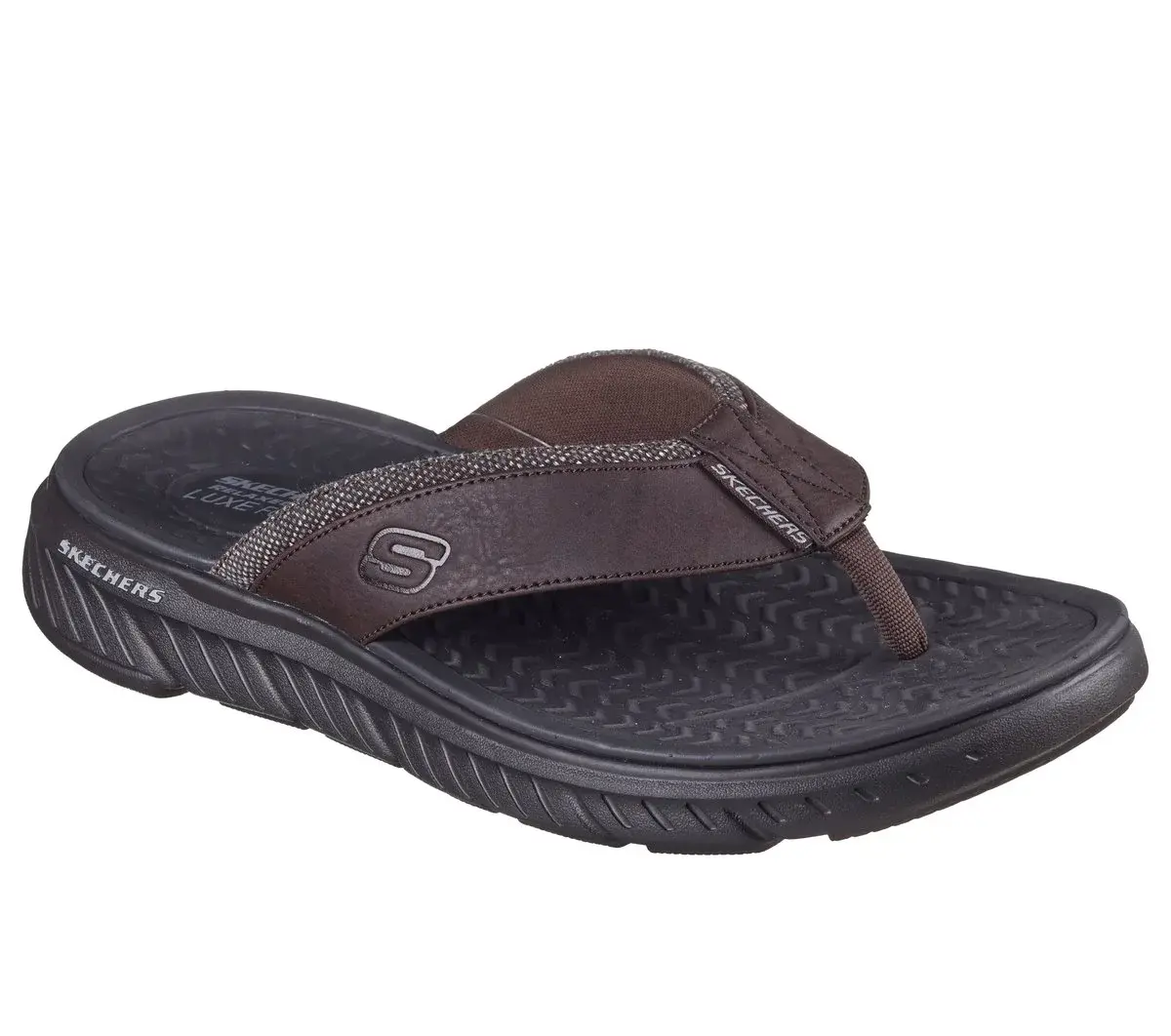 Sunny-weather comfort and classic style combine in Skechers Relaxed Fit®: Harver – Farley. This casual thong sandal features a faux leather and tweed fabric upper with a Luxe Foam® footbed and a durably flexible outsole.