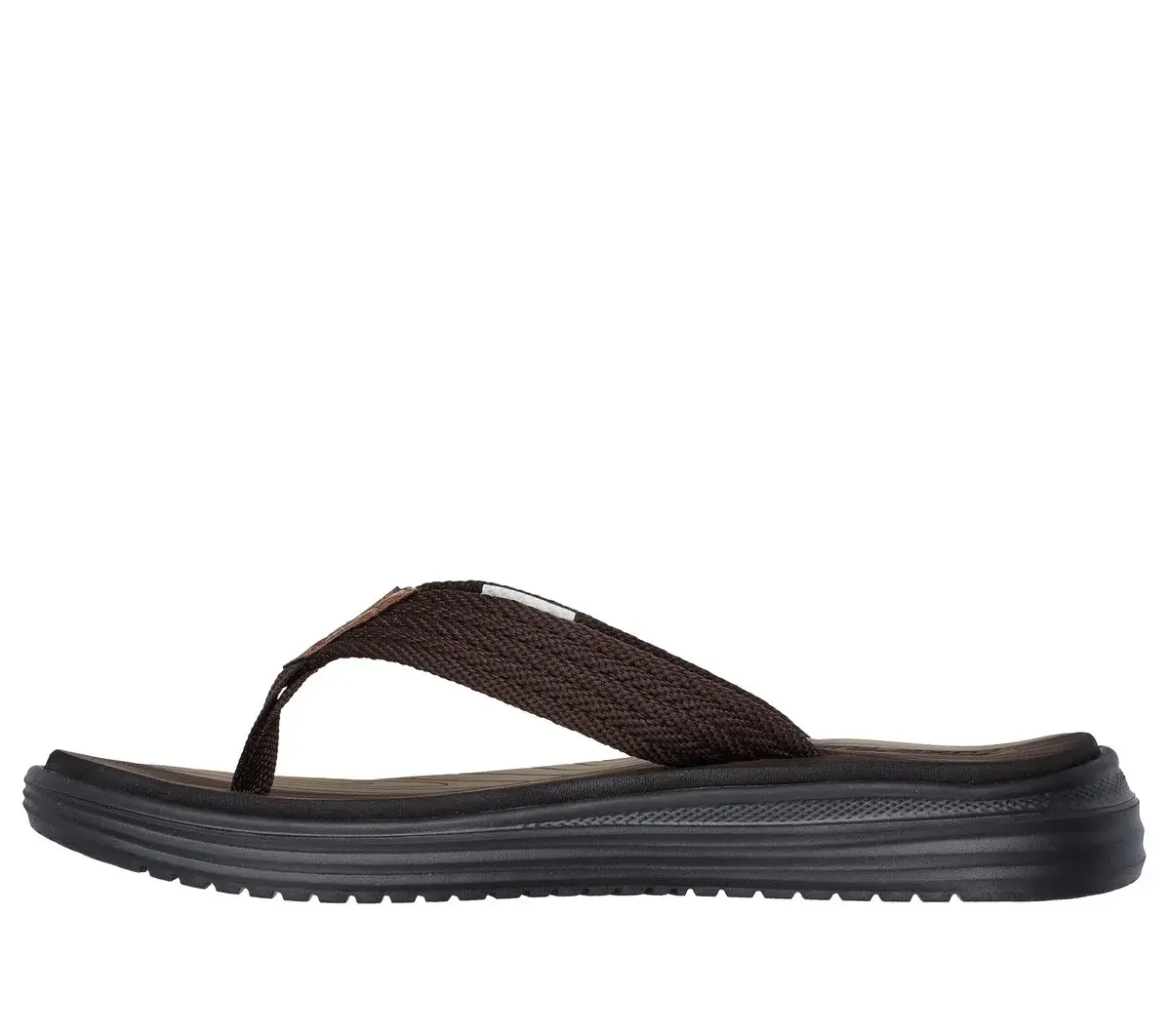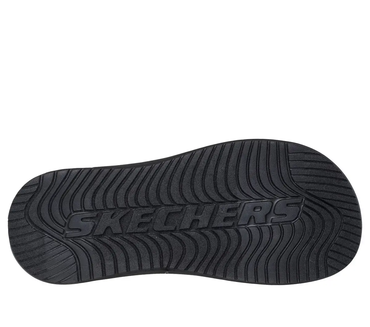 Bring on the sand, surf, and sun in Skechers Relaxed Fit®: Proven SD – Korey. This roomy 3-point thong sandal features a woven webbed upper and a contoured Luxe Foam® footbed.