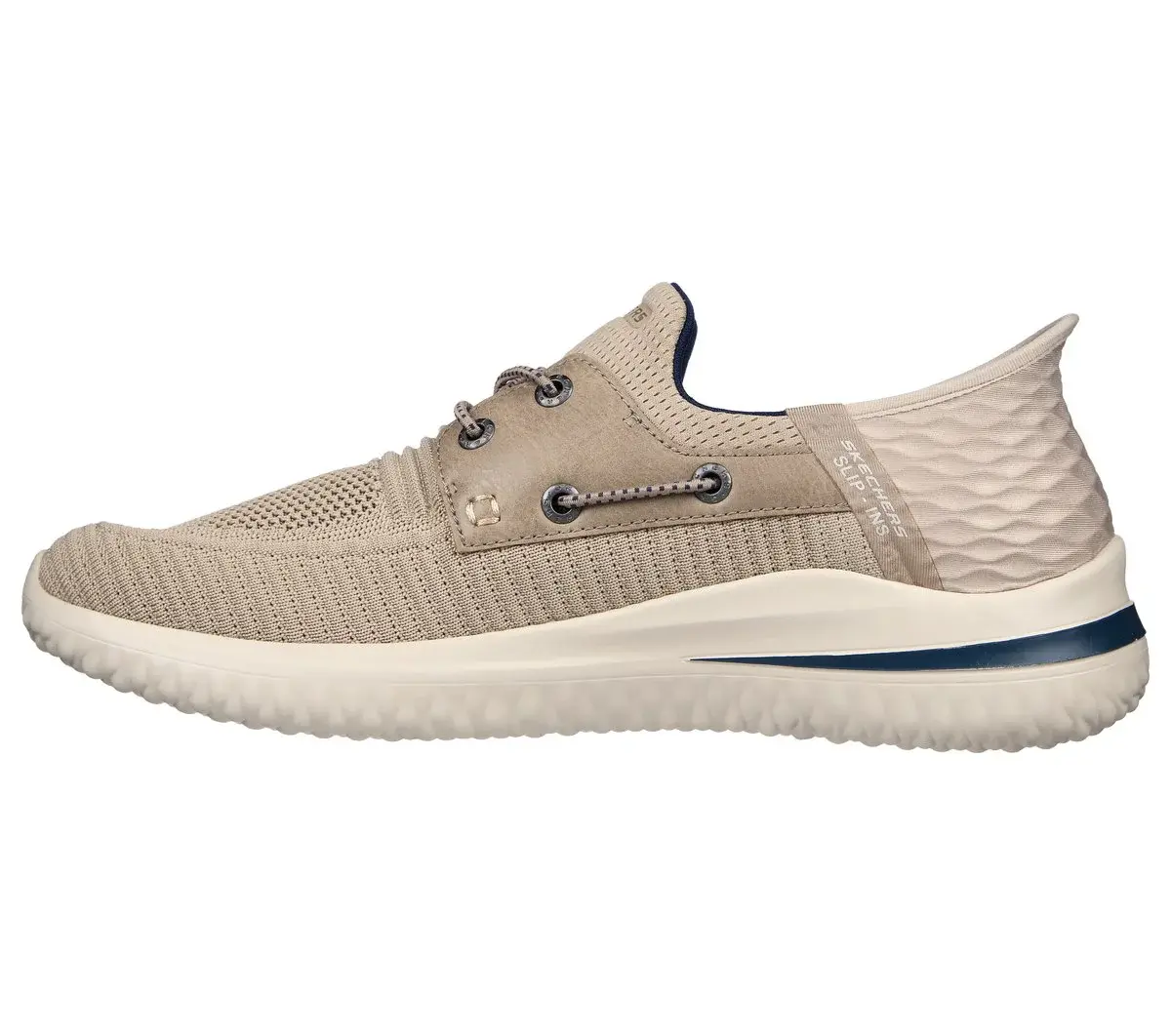 Go Hands Free™ Simply step in and go wearing Skechers Hands Free Slip-ins®: Delson 3.0 – Roth. Designed with our exclusive Heel Pillow™, this slip-on boat style features an engineered knit and synthetic upper with stretch laces, a Skechers Air-Cooled Memory Foam® comfort insole, and Goga Mat Arch™ cushioning for added support.