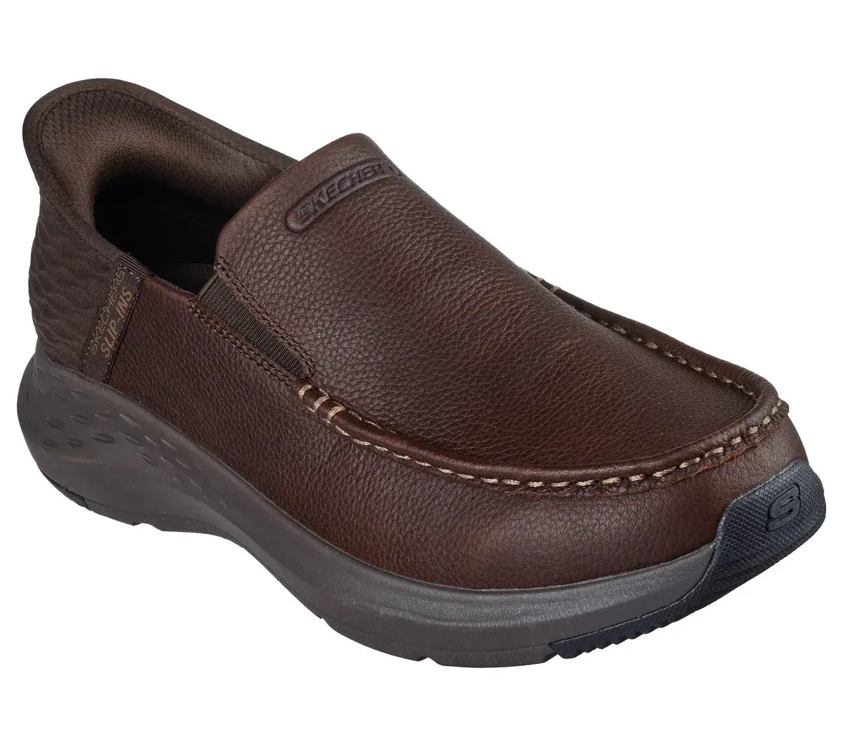 Go Hands Free™ Step into easy-wearing comfort and classic style with Skechers Hands Free Slip-ins® Relaxed Fit®: Parson – Oswin. Designed with our exclusive Heel Pillow™, this laceless fit moc toe style features a Skechers Slip-ins® molded heel panel, leather upper, Skechers Air-Cooled Memory Foam® insole, and Goga Mat Arch™ cushioning for added support.