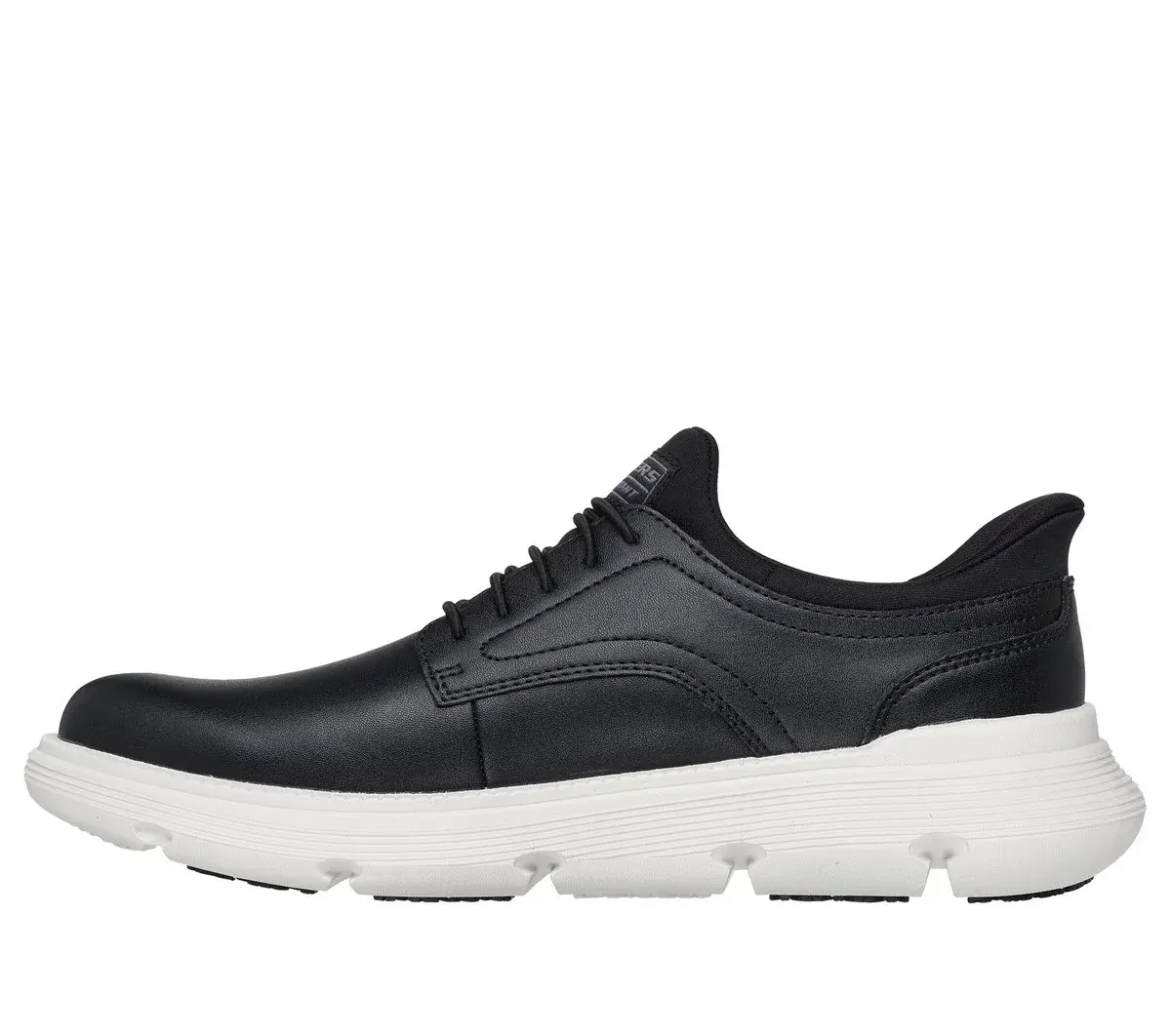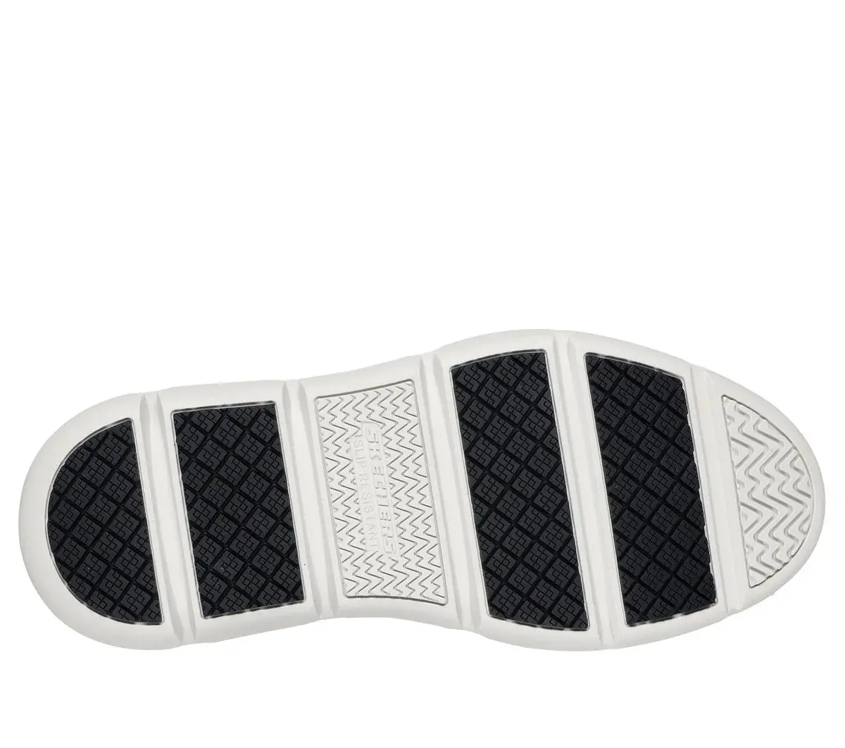 Enjoy effortless wearability with comfort and style in Skechers Hands Free Slip-ins® Work™ Slip-Resistant: Garza. Designed with our exclusive Heel Pillow™, this Oxford safety slip-on features a smooth leather upper with fixed stretch laces, a Skechers Air-Cooled Memory Foam® insole, and a slip-resistant traction outsole with flex grooves.
