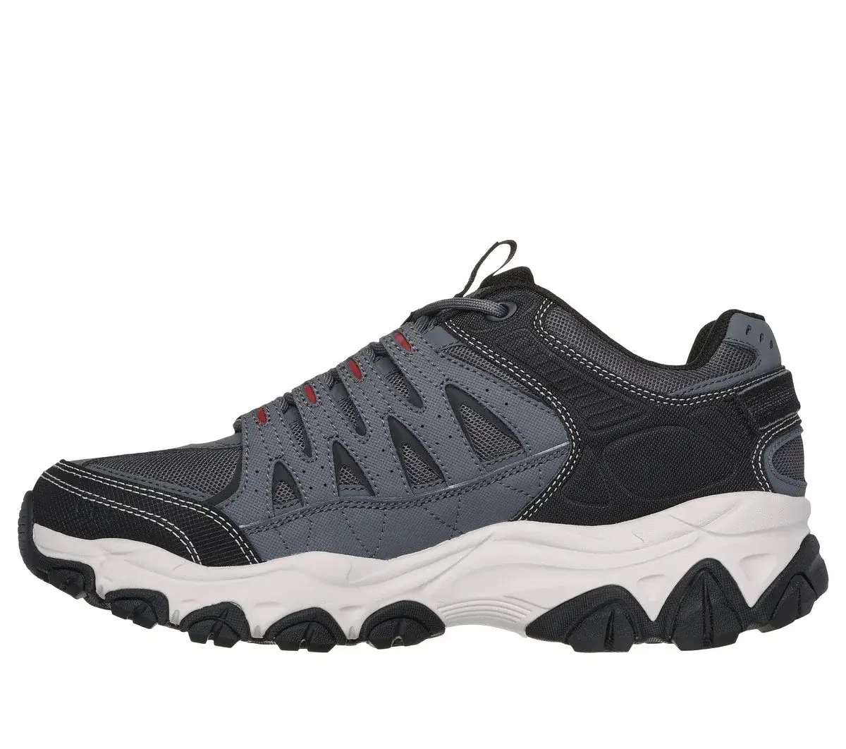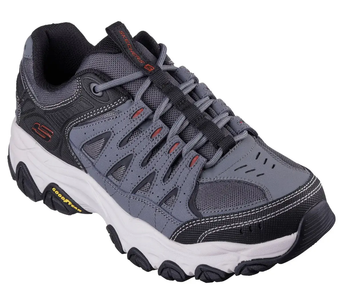Explore wild terrain in comfort with Skechers After Burn M.Fit 2.0. This lace-up outdoor trail design features a leather, synthetic and mesh upper with a cushioned Skechers Memory Foam™ insole and Goodyear® Rubber Outsole.