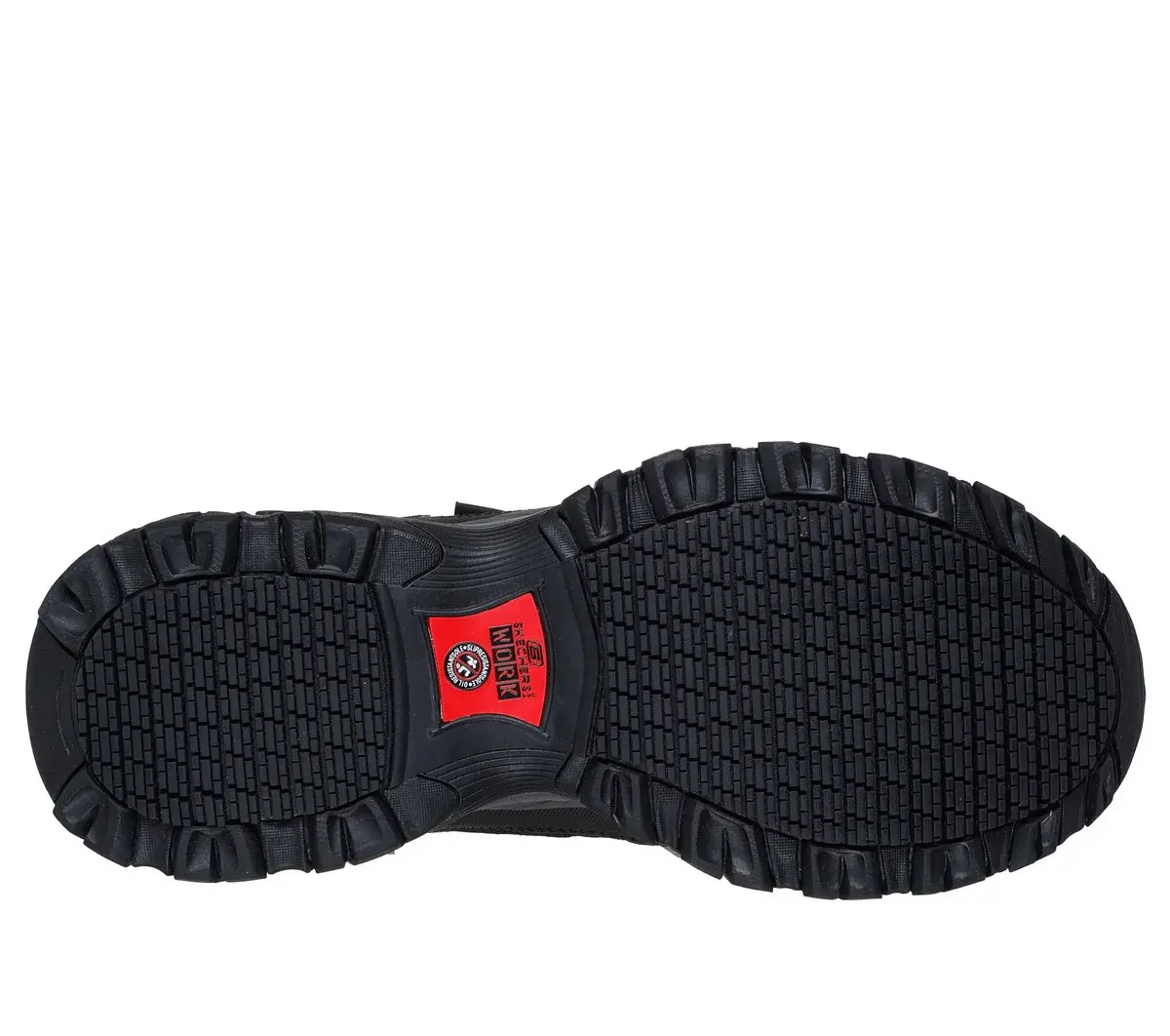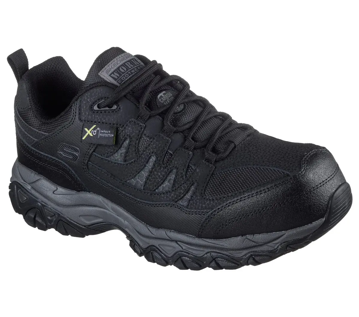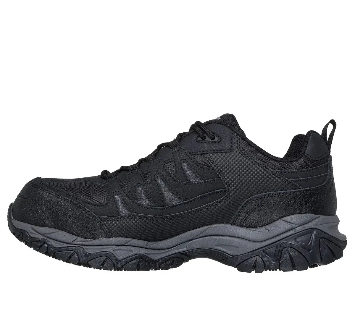Shift into comfort and safety you can depend on in Skechers Work™: Holdredge. This durable slip-resistant style features a lace-up leather and synthetic upper with a cushioned Skechers Air-Cooled Memory Foam® comfort insole, and a carbon nano safety toe with an internal metatarsal guard.