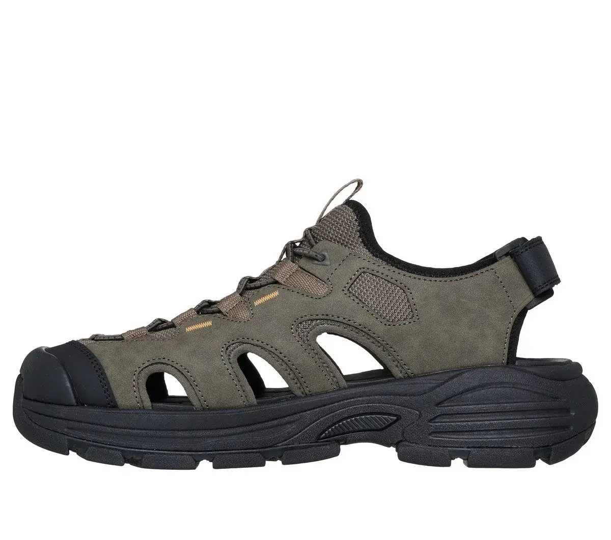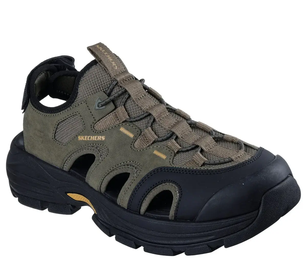Rugged outdoor style meets modern comfort with Skechers Relaxed Fit®: Fairport – Bradley. This roomy closed-toe sandal features a mesh and synthetic overlay upper with fixed stretch laces, adjustable back strap, and a cushioned Luxe Foam® insole.