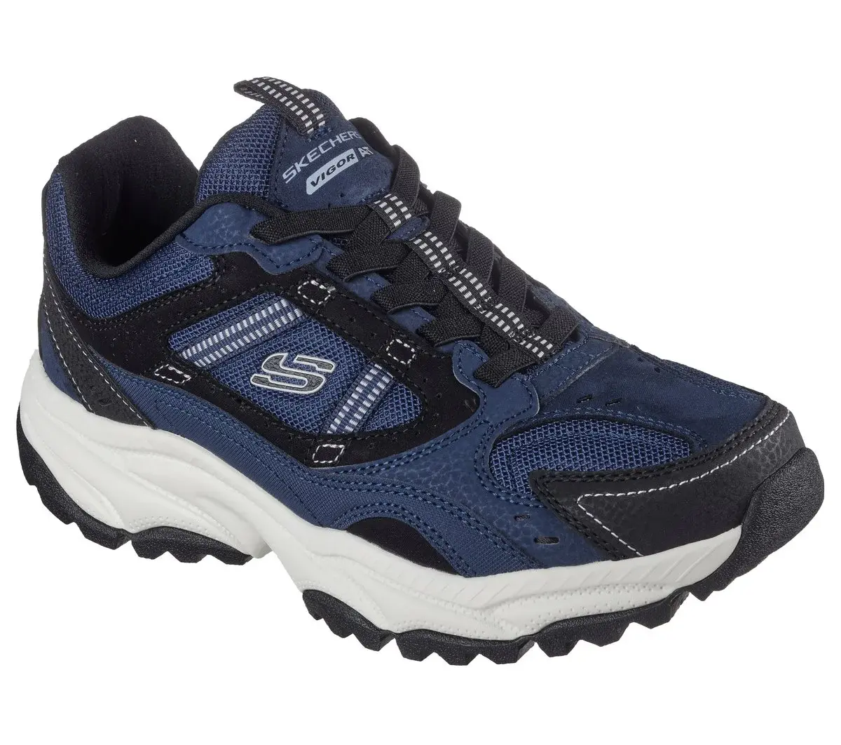 Reach to new heights of comfort in Skechers Vigor AT – Three Corners. This outdoor trail design features a suede and synthetic upper with stretch laces and a cushioned Skechers Air-Cooled Memory Foam® comfort insole.