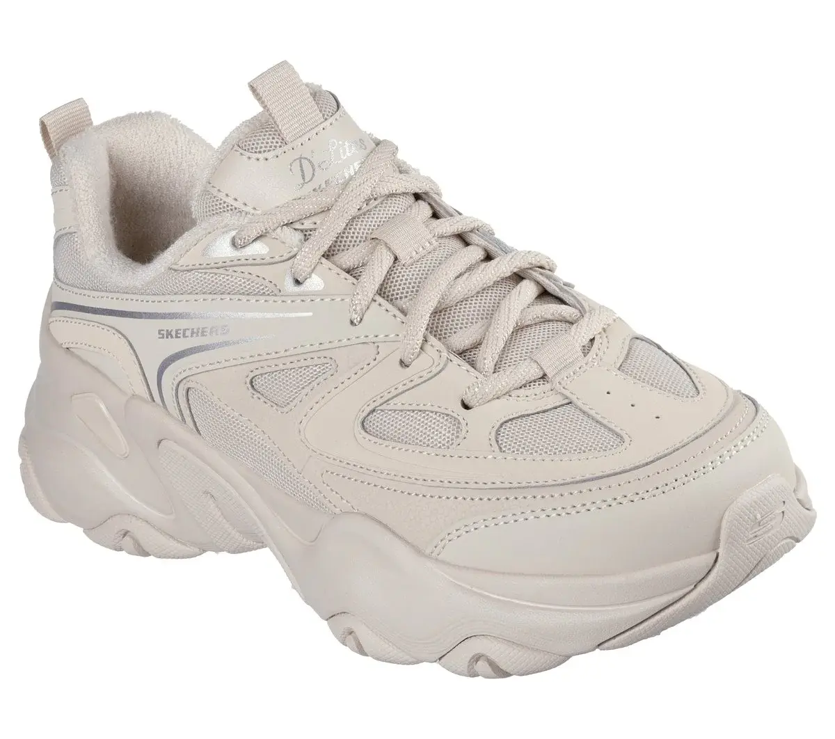 Sporty style and comfort combine in Skechers D’Lites® 5.0 – Breaking Rules. This casual lace-up sneaker features a mesh upper with leather overlays, Skechers Air-Cooled Memory Foam® insole, and a well-cushioned midsole.