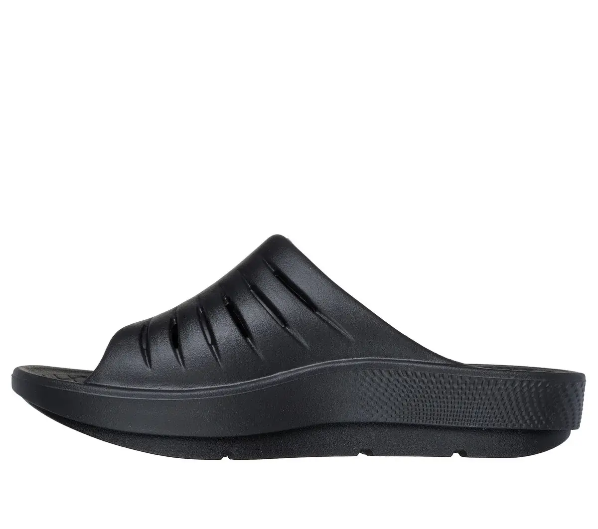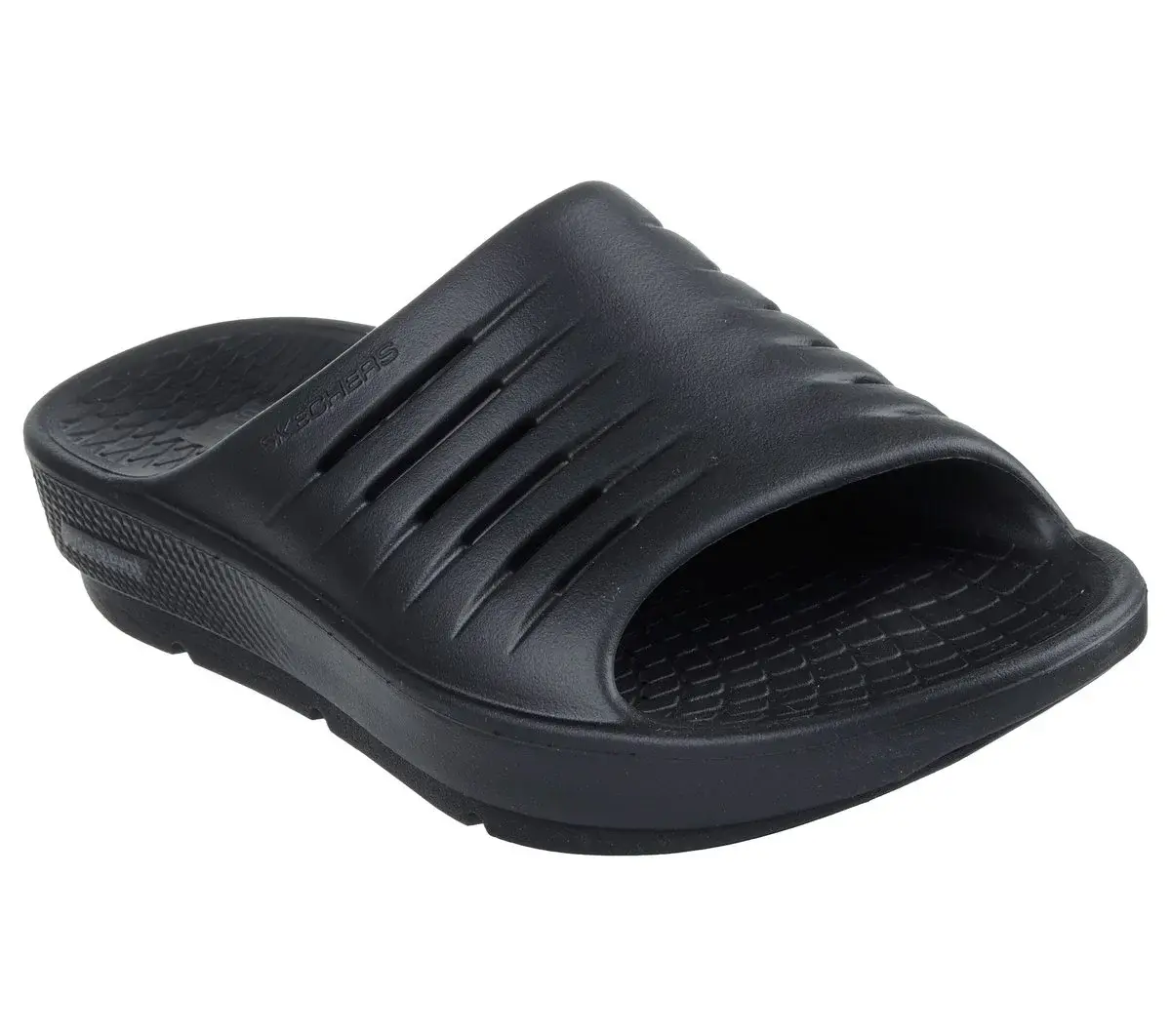 Relax in specialized comfort and style wearing Skechers GO RECOVER® Refresh. This athletic recovery slide sandal has been granted the APMA Seal of Acceptance and features a synthetic upper with linear perforations and premium HYPER BURST® foam with Arch Fit® support that redistributes pressure for impact reduction.