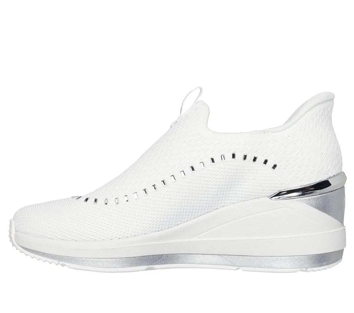 Step out with eye-catching style wearing Skechers Hands Free Slip-ins® Mark Nason®: The Triple Wedge – Clariti. Designed with our exclusive Heel Pillow™, this high-wedge fashion sneaker features a knit upper with faux emerald-cut diamonds, a high-gloss heel clip, Memory Foam Lux insole cushioning, and a glitter trim midsole.