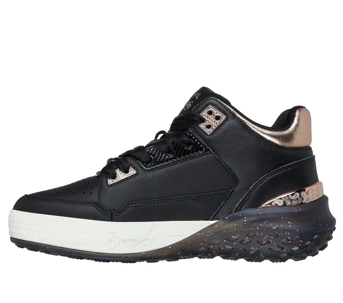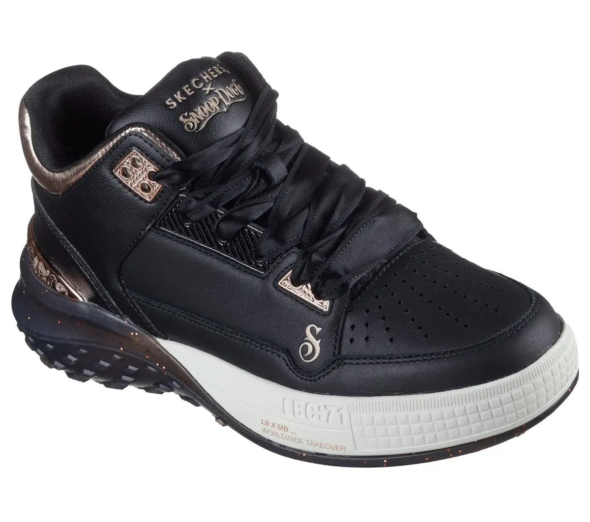 Dropping like it’s hot: Skechers x Snoop Dogg: Sizzle – Buckets. This fly and fresh mid-top court style is as unique as the D-O-Double G himself. Featuring a smooth and perforated premium leather upper with metallic collar and heel trim, a glitter-speckled outsole, and an oh-so-cushy Skechers Air-Cooled Memory Foam® insole.