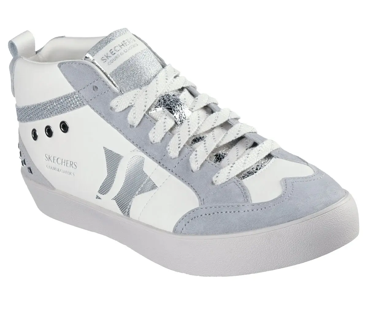 Find your star power style with uncompromising comfort wearing Skechers Strand Star – Studded Step. This mid-top fashion sneaker features a pig leather upper with heel studs, a hidden wedge court-style midsole, lace-up front, debossed metallic star, and a Skechers Air-Cooled Memory Foam® cushioned insole.