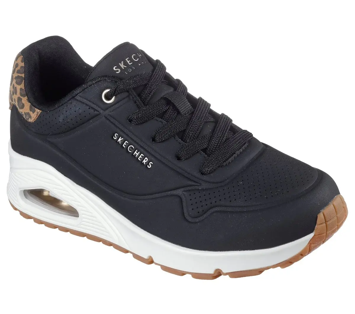 Walk on air in the wildly comfortable Skechers Street™ Uno – Jungle Nite. This lace-up fashion sneaker features a synthetic upper with leopard print heel mustache, a Skechers Air-Cooled Memory Foam® insole, and a Skech-Air® visible air-cushioned midsole.