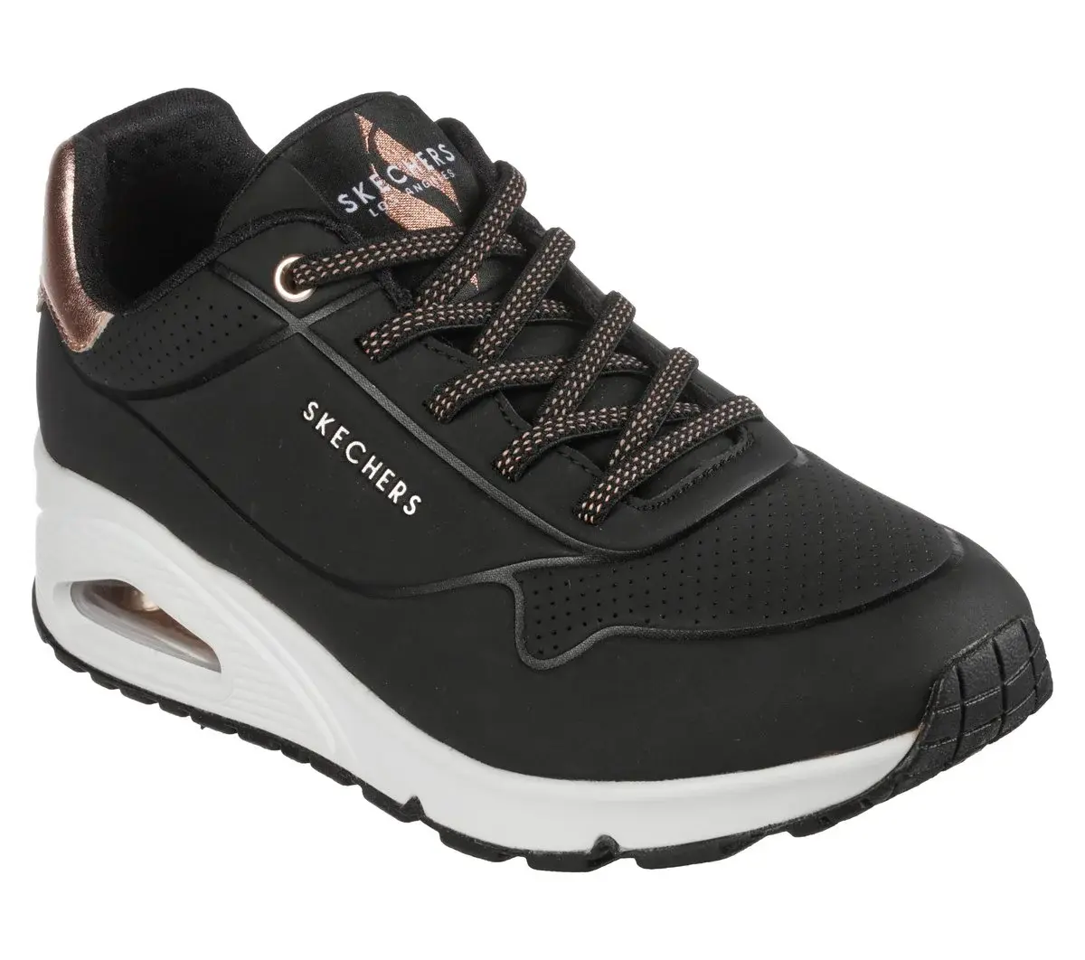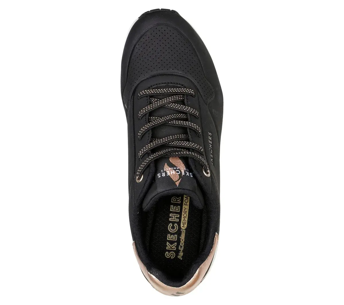 Enjoy a classic style this season wearing Skechers Street™ Uno – Shimmer Away. This wedge fit fashion sneaker features a synthetic durabuck upper with metallic heel trim, stretch laces, a Skechers Air-Cooled Memory Foam® insole, and a Skech-Air® visible airbag midsole.