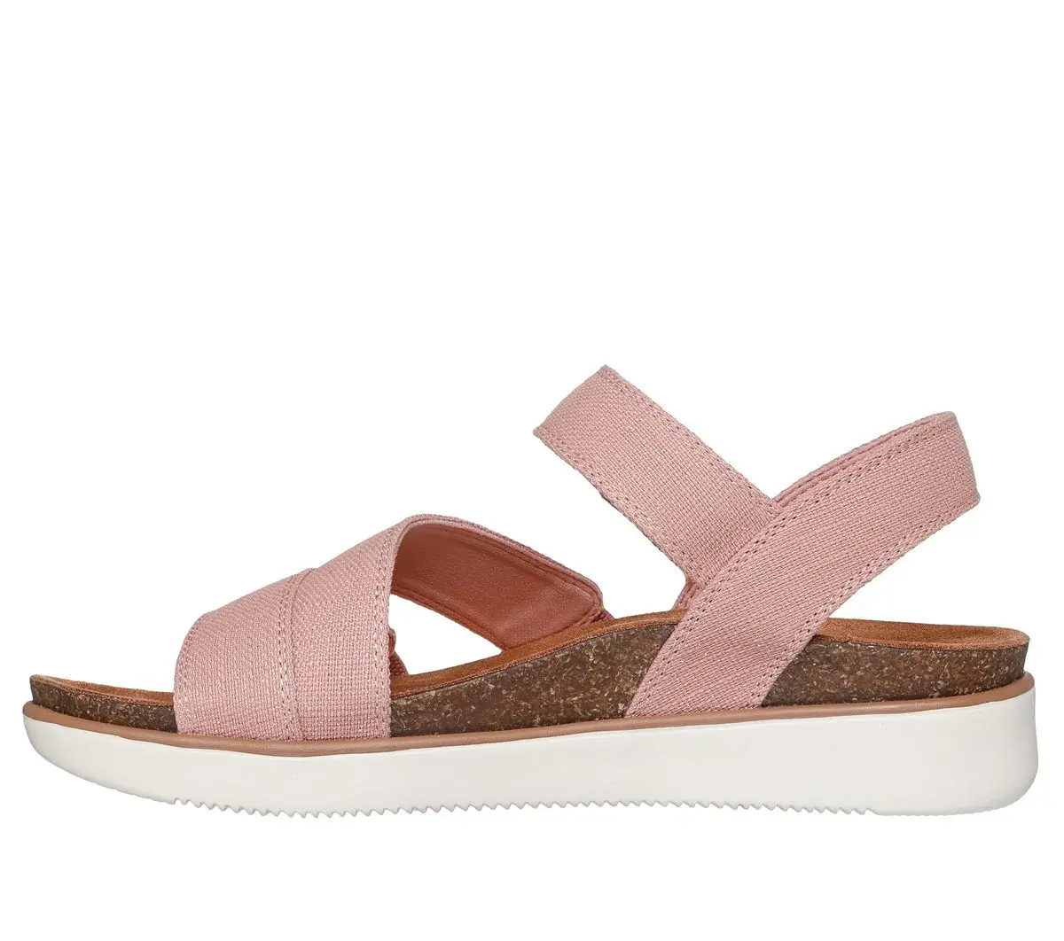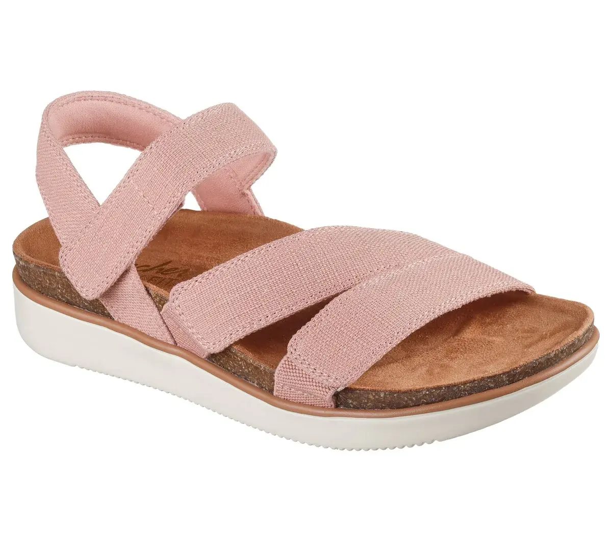 Bring sensibly modern design to your warm weather look wearing Skechers Lifted Comfort – Dreamy Eyes. This slingback vegan sandal features a sparkly canvas upper with an adjustable hook-and-loop closure and a cushioned comfort footbed with cork trim.