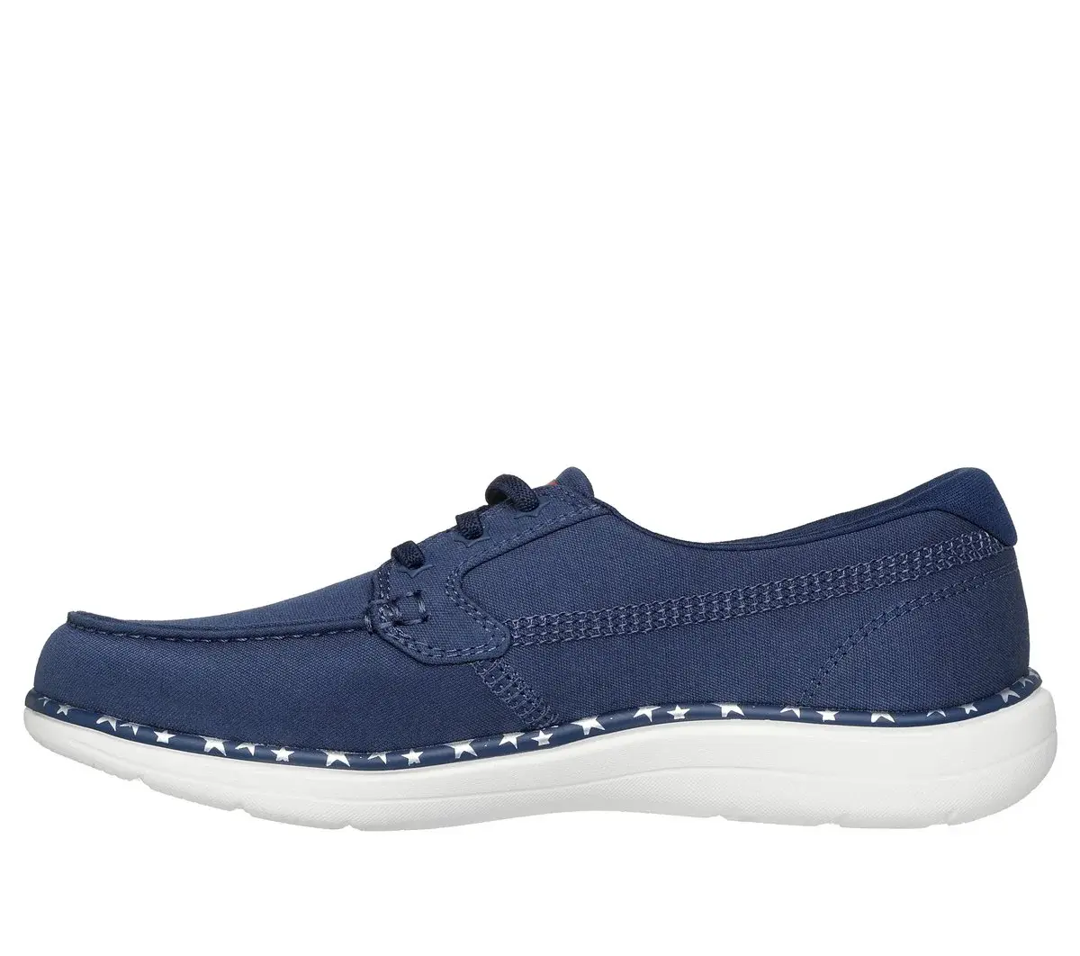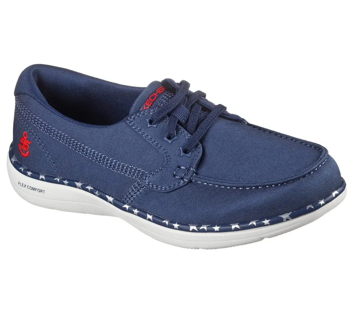 Salute your comfort in nautical style wearing Skechers On-the-GO® Flex Radiant – Liberty. This ‘Americana’ themed boat style features a canvas upper with fixed deco laces, star print midsole trim, lightweight ULTRA GO® cushioning, and a high-rebound Skechers Air-Cooled Goga Mat™ insole.