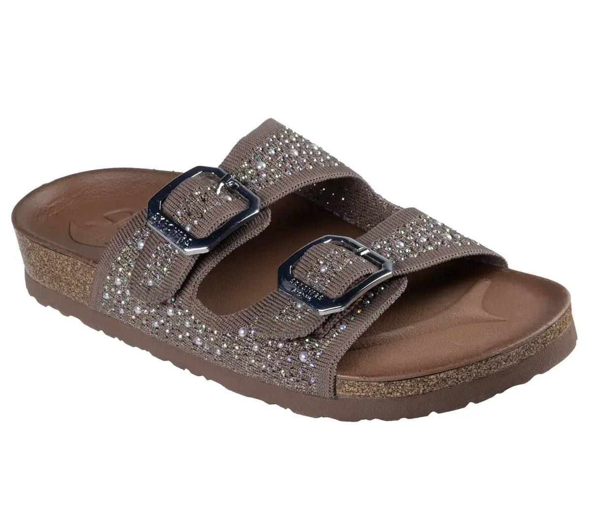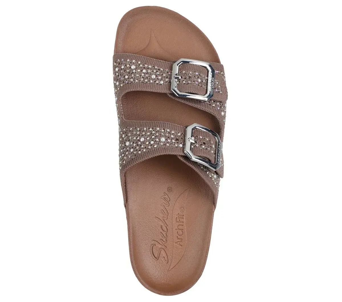 Dazzle your way through the day in laid-back comfort wearing Skechers Arch Fit® Granola – Casually Stunning. This vegan double band slide sandal has been granted the APMA Seal of Acceptance and features a rhinestone knit upper and a supportive Arch Fit® footbed with Luxe Foam® cushioning.