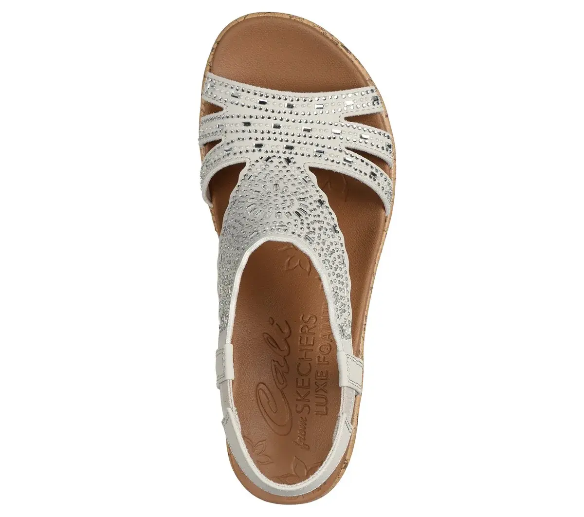Shine in stylish comfort with Skechers Cali® Beverlee – Dazzling Charm. This casual strappy wedge-heeled pull-on style features a rhinestone embellished synthetic upper with cork veneer midsole, plus a cushioned Luxe Foam® comfort footbed.