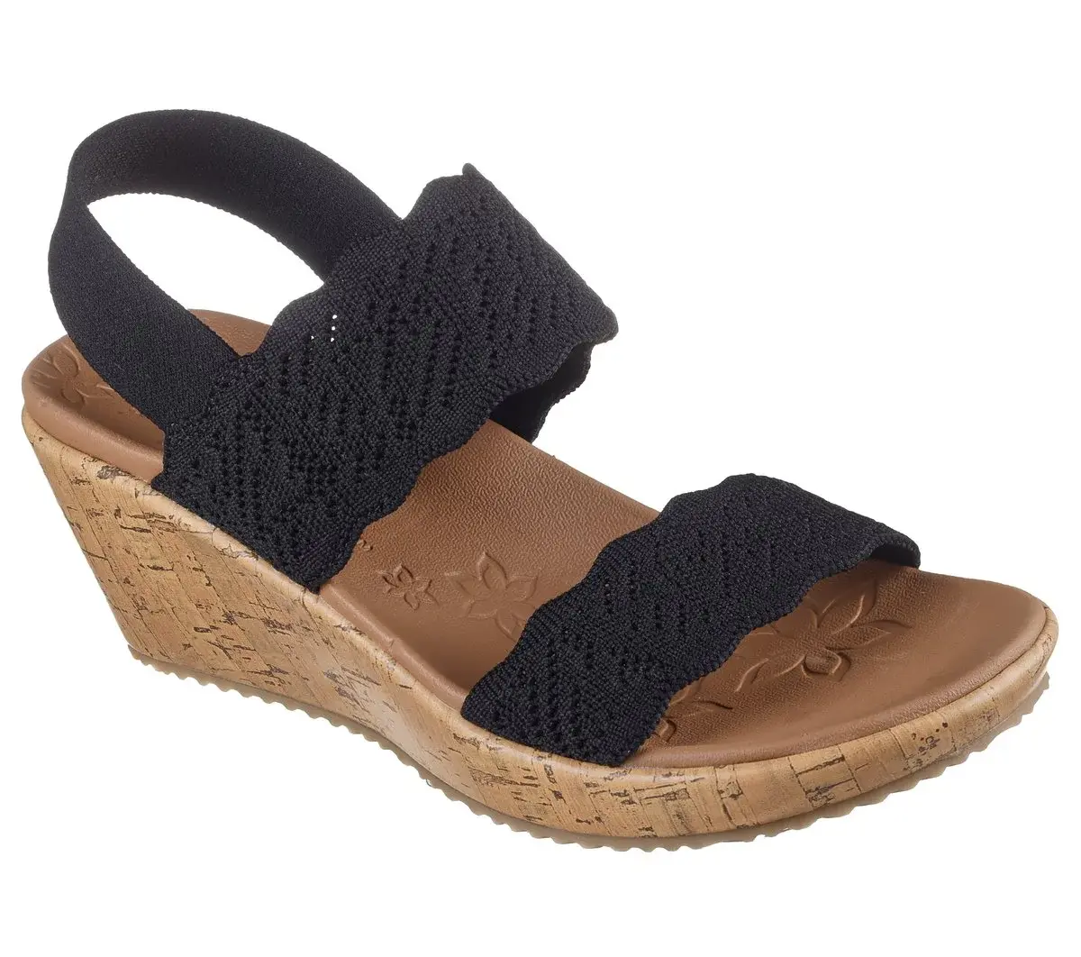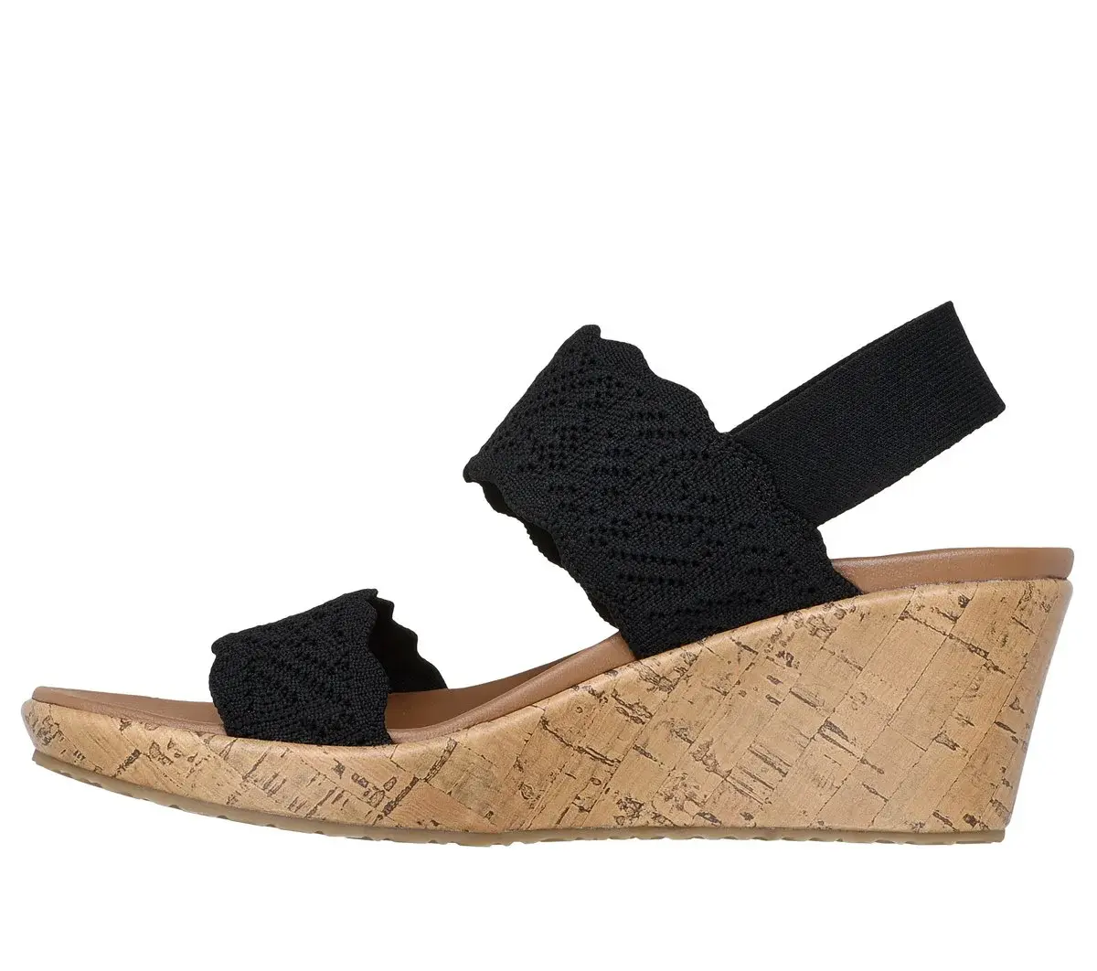 Summery style and absolute comfort combine in Skechers Cali® Beverlee – Timeless Touch. This slingback sandal features a dual crossband crochet upper with a cork veneer wedge midsole and a cushioned Luxe Foam® footbed.