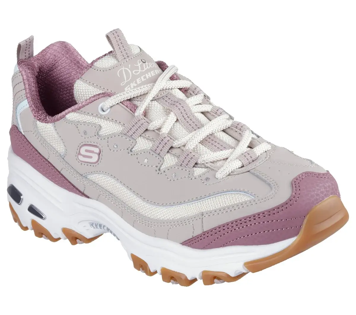 Trending style and comfort combine in the iconic classic Skechers D’Lites® – Popular Vote. This lace-up fashion style features a leather and mesh upper with synthetic trim and a cushioned Air-Cooled Memory Foam® insole.