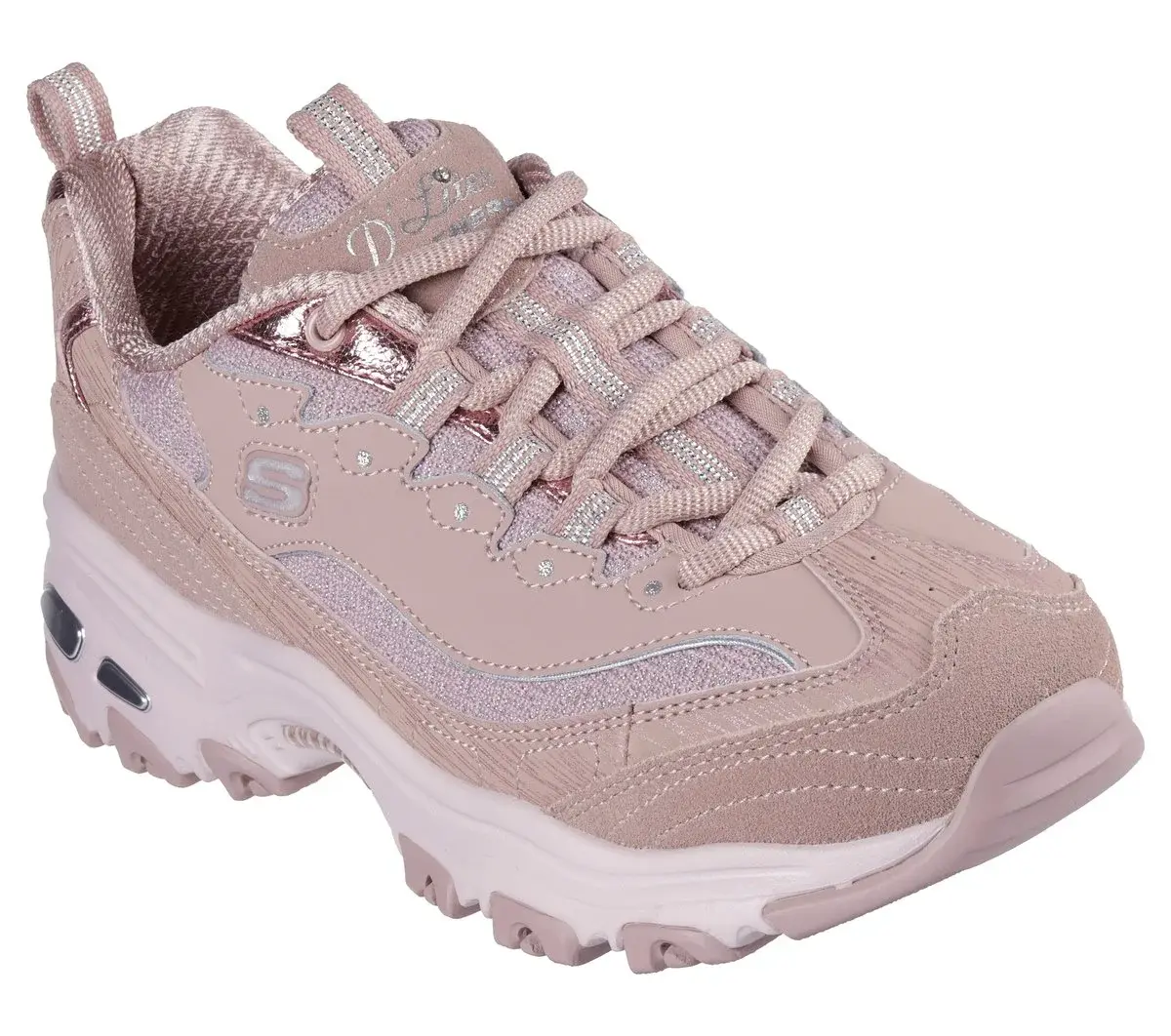A classic look gets updated with comfort in Skechers D’Lites® – Reflections. This lace-up fashion style features a leather upper with metallic trim and a cushioned Skechers Air-Cooled Memory Foam® insole.