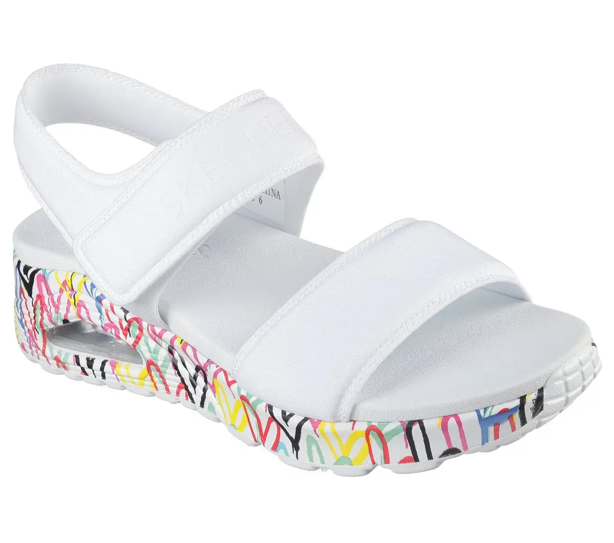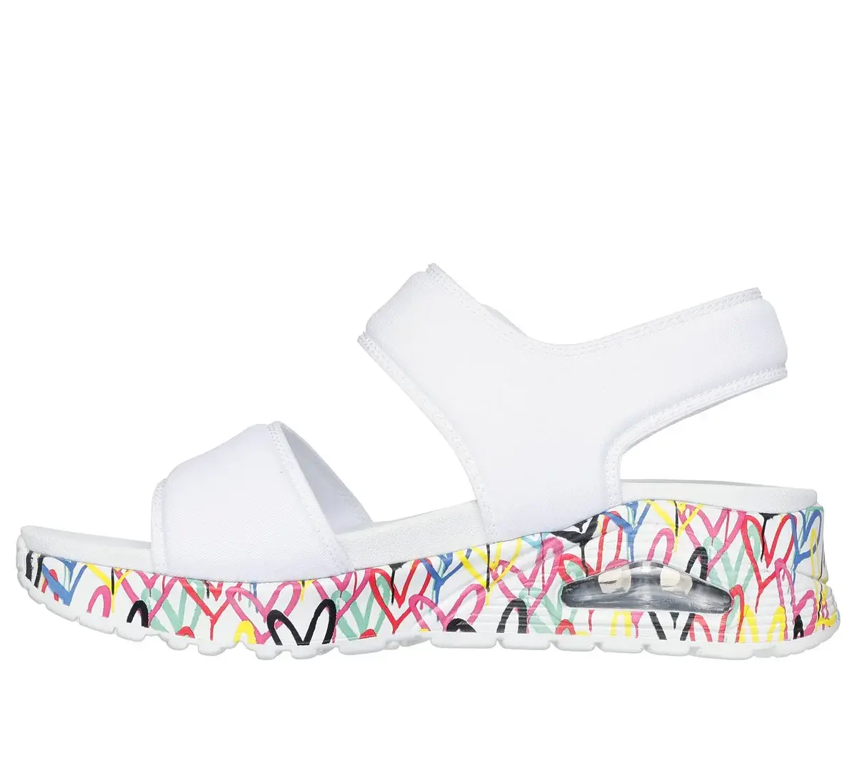 Internationally renowned muralist James Goldcrown brings his iconic #Lovewall heart designs to Skechers in this inspiring collaboration. Show your creative style with Skechers Street™ x JGoldcrown: Uno – Sea Of Love. This fashion sandal features a print of the artist’s signature heart design on the midsole and a woven fabric upper with an adjustable slingback strap. The design is complete with a cushioned Yoga Foam® footbed and a visible Skech-Air® airbag midsole.