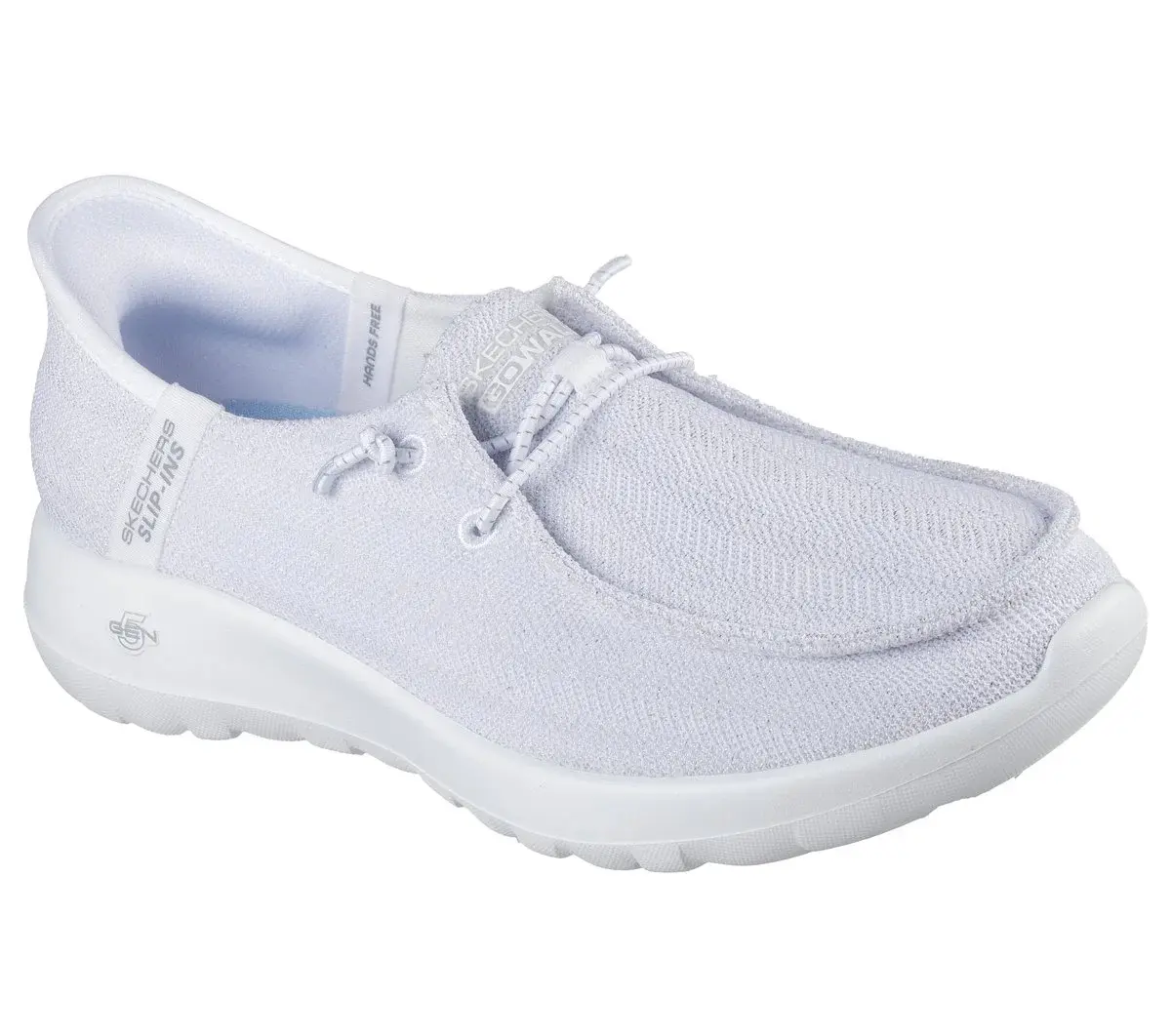 Step up your routine with easygoing comfort wearing Skechers Slip-ins®: GO WALK Joy™ – Fantasia. Designed with our exclusive Heel Pillow™, this laced slip-on style features a metallic knit upper with a cushioned Skechers Air-Cooled Memory Foam® insole and lightweight 5-GEN® cushioning.