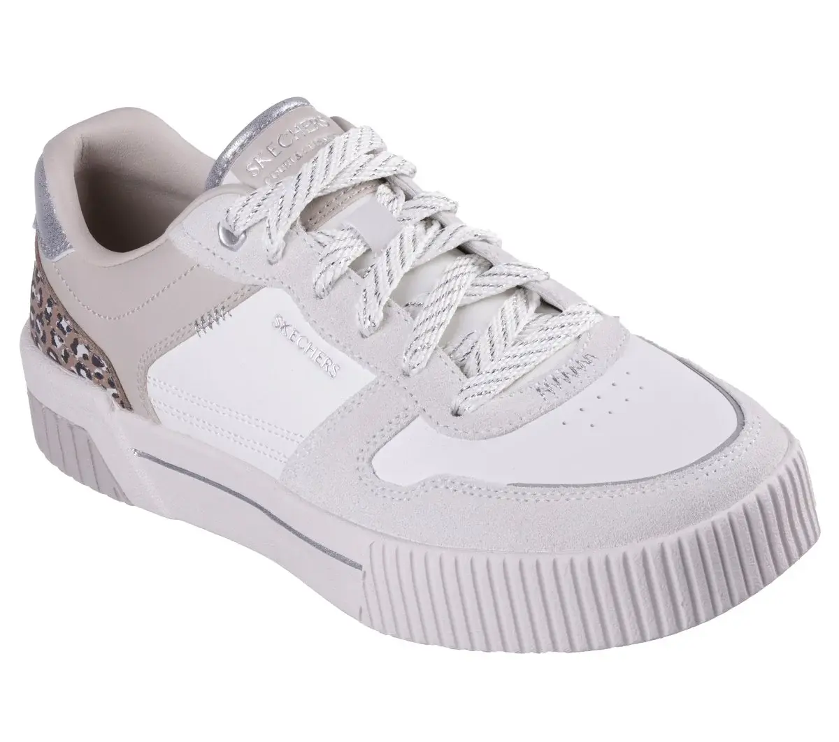 Enjoy purrrfectly styled court comfort wearing Skechers Jade – Lustrous Luxury. This low-top lace-up features a duraleather and suede overlay upper with a leopard print heel cup, metallic mustache detail, and a Skechers Air-Cooled Memory Foam[registered cushioned comfort insole.