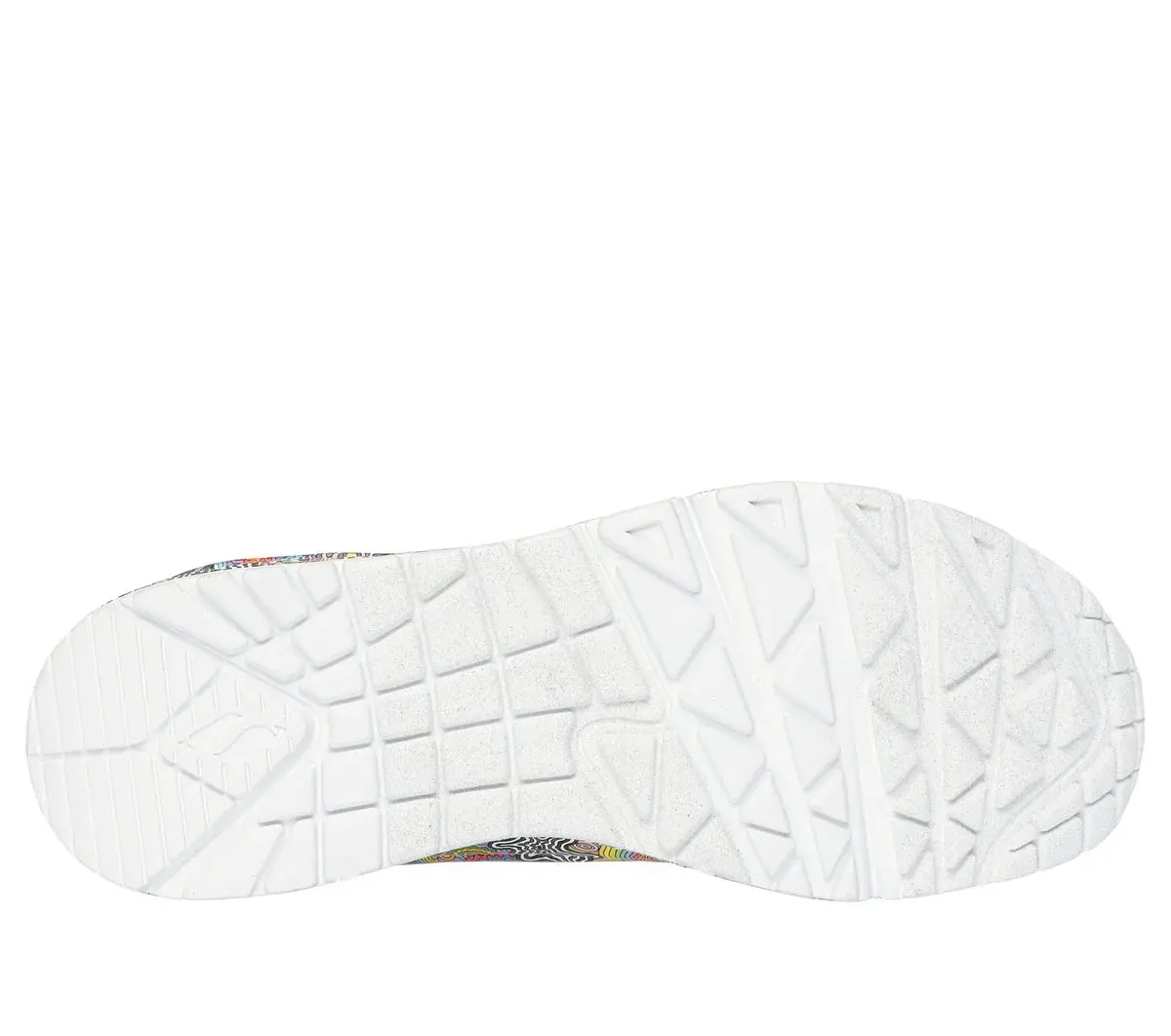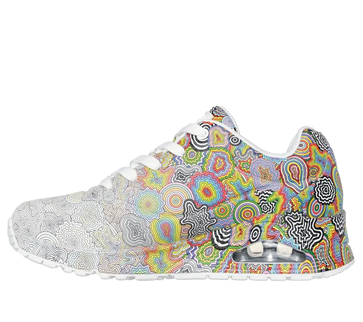 Jen Stark brings her hypnotic and captivating colorful patterns to Skechers Street™ in this creative collaboration. The eye-catching Skechers Street™ x Jen Stark: Uno – Kaleidoscope Dream features the artist’s signature drip design in a black & white-to-color gradient on a synthetic durabuck upper, with a Skechers Air-Cooled Memory Foam® insole and a visible Skech-Air® airbag midsole.