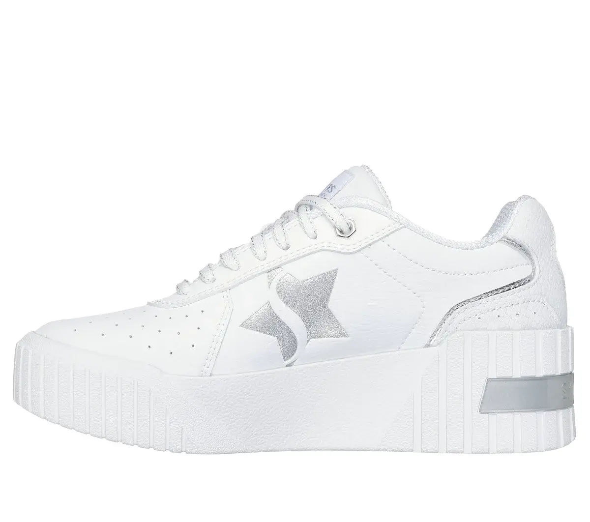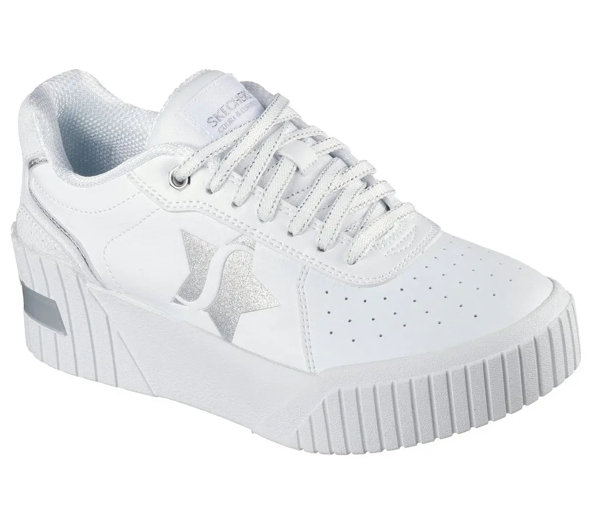 Enjoy classic court-style looks with Skechers Jumbo Jade – Lifted Chic. This low-top lace-up features a duraleather upper with reptile textured details and metallic overlays, plus a cushioned Skechers Air-Cooled Memory Foam® comfort insole.