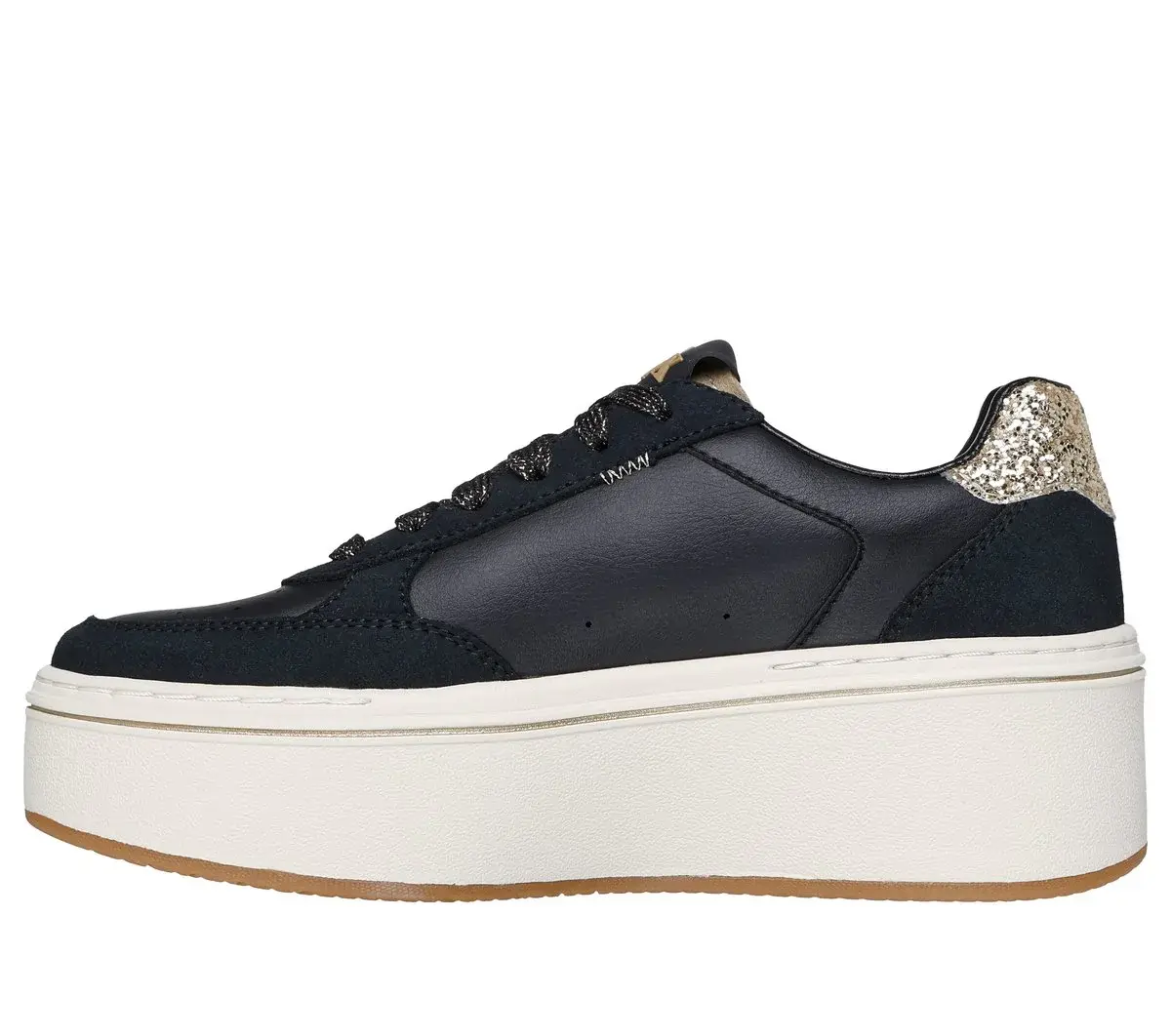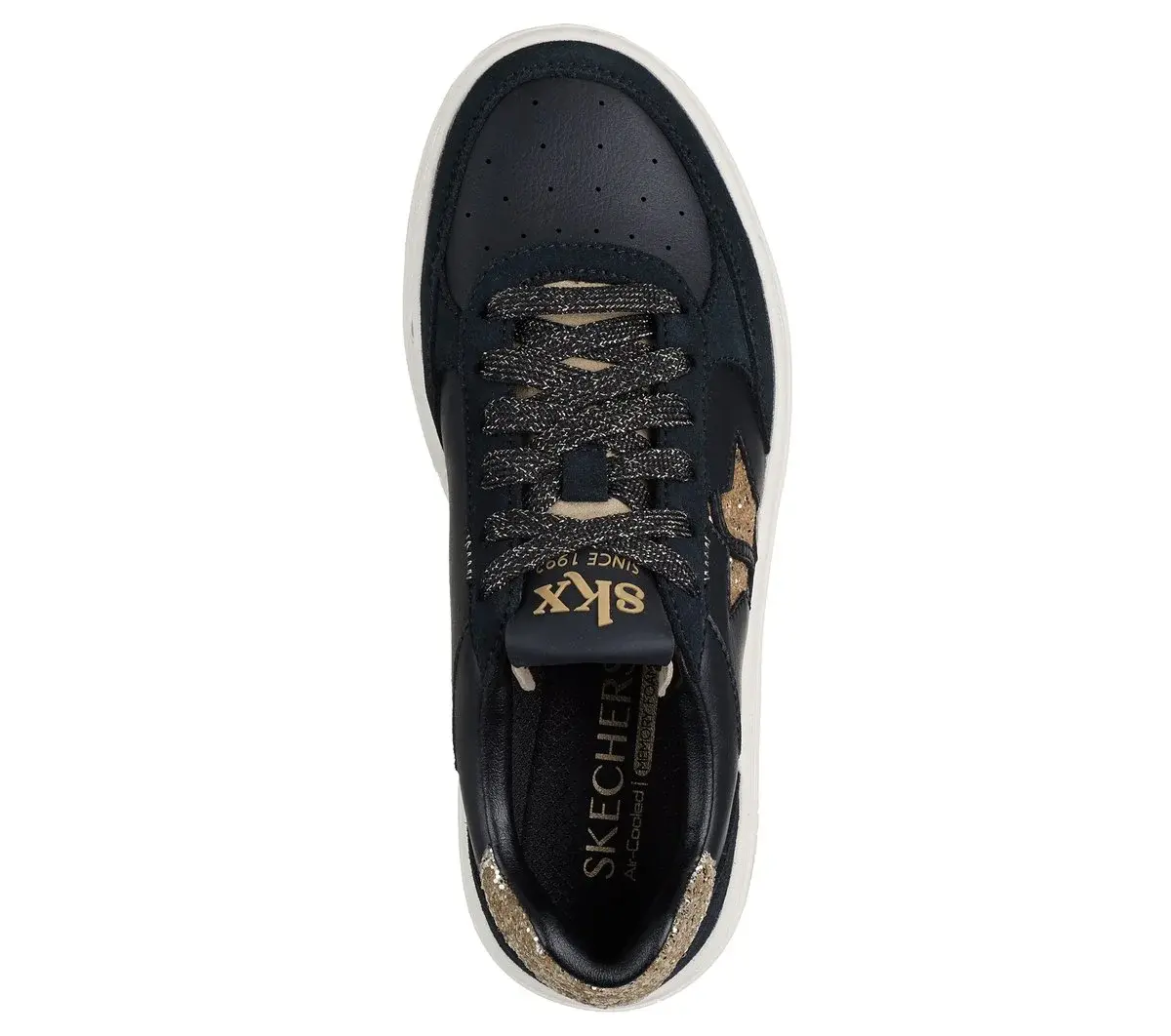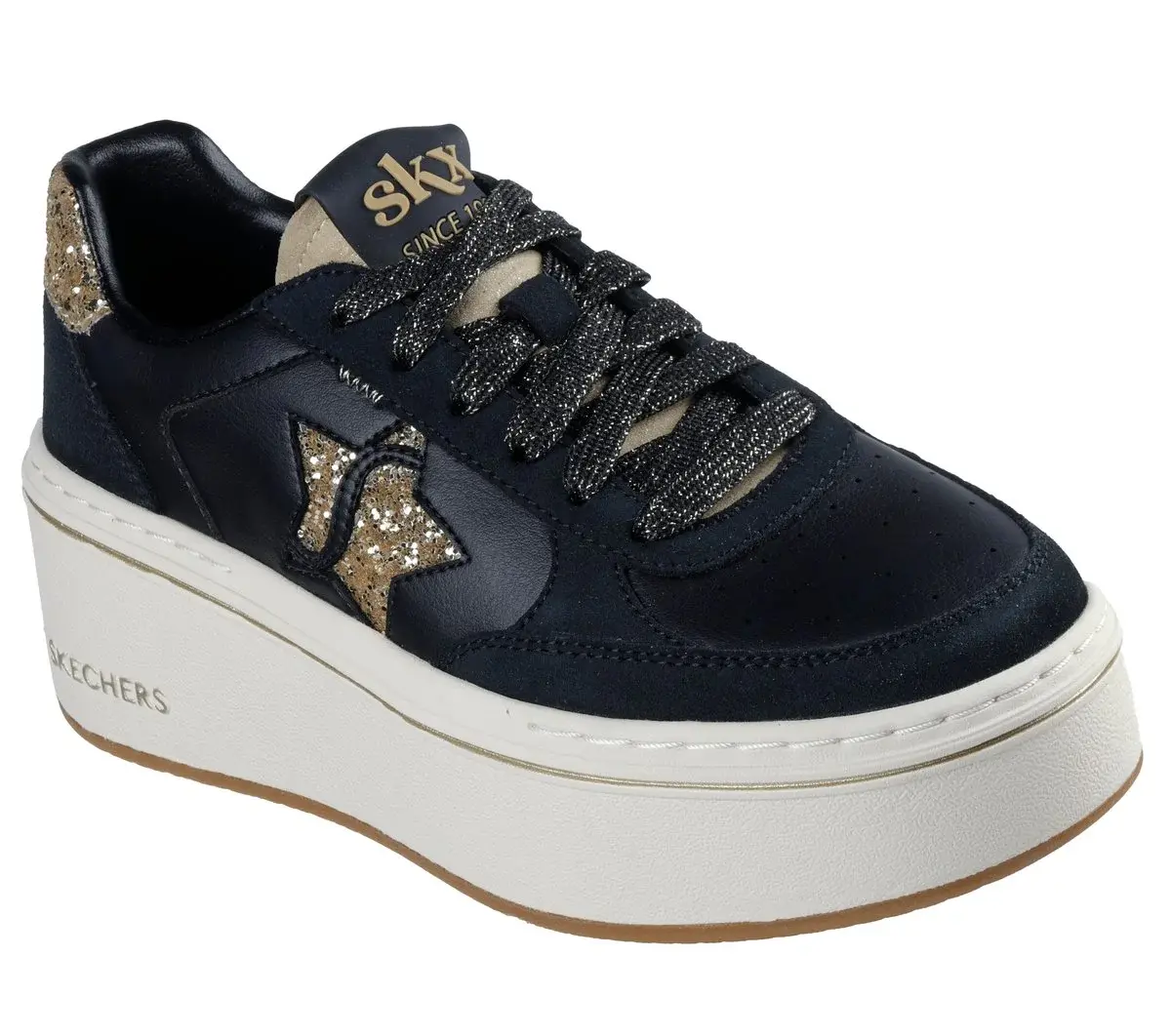 Reach new heights of style with Skechers Paloma – Brightest Star. This lace-up platform court style features a duraleather and genuine suede overlay upper with a glittery star detail and a cushioned Skechers Air-Cooled Memory Foam® comfort insole.