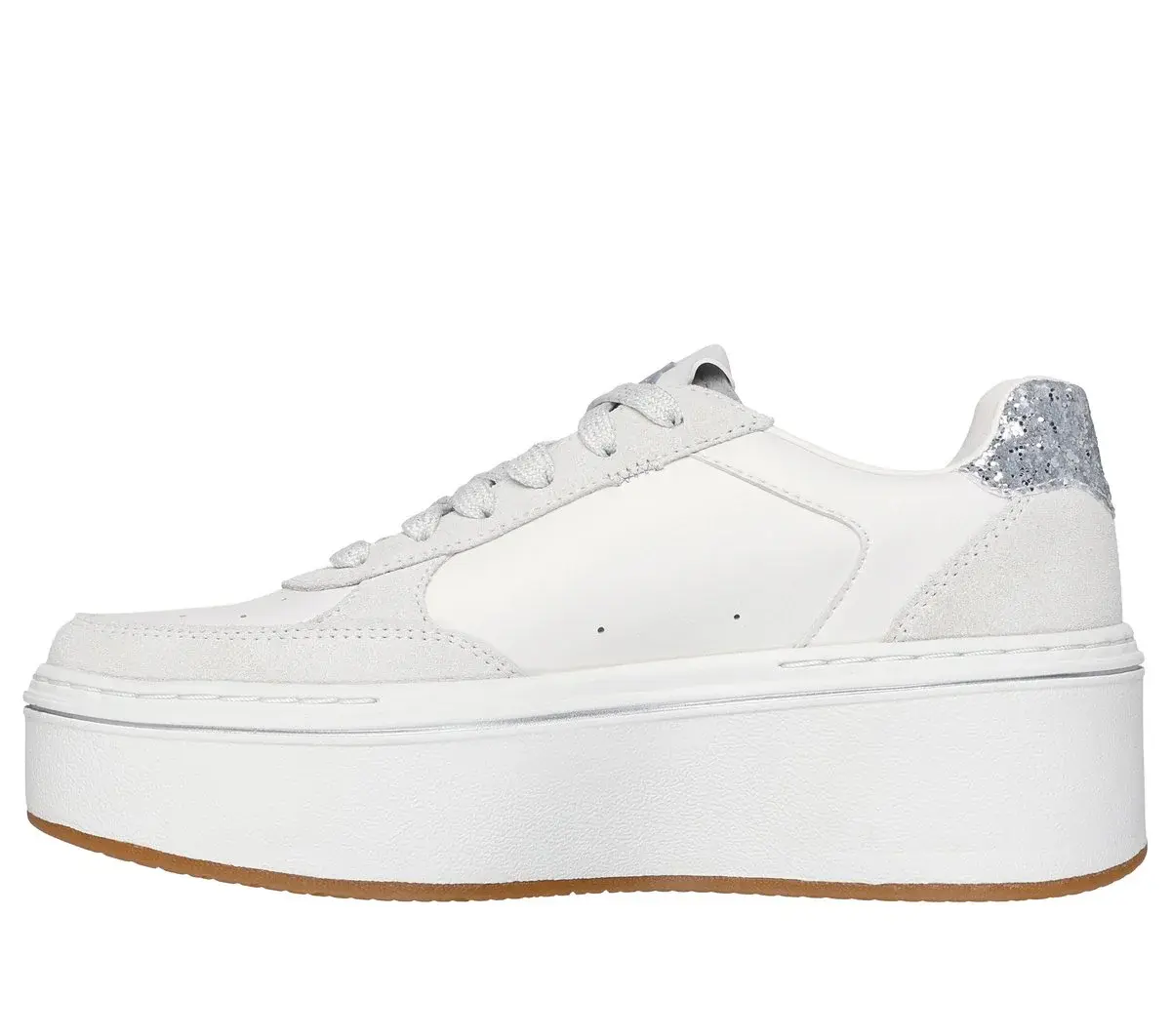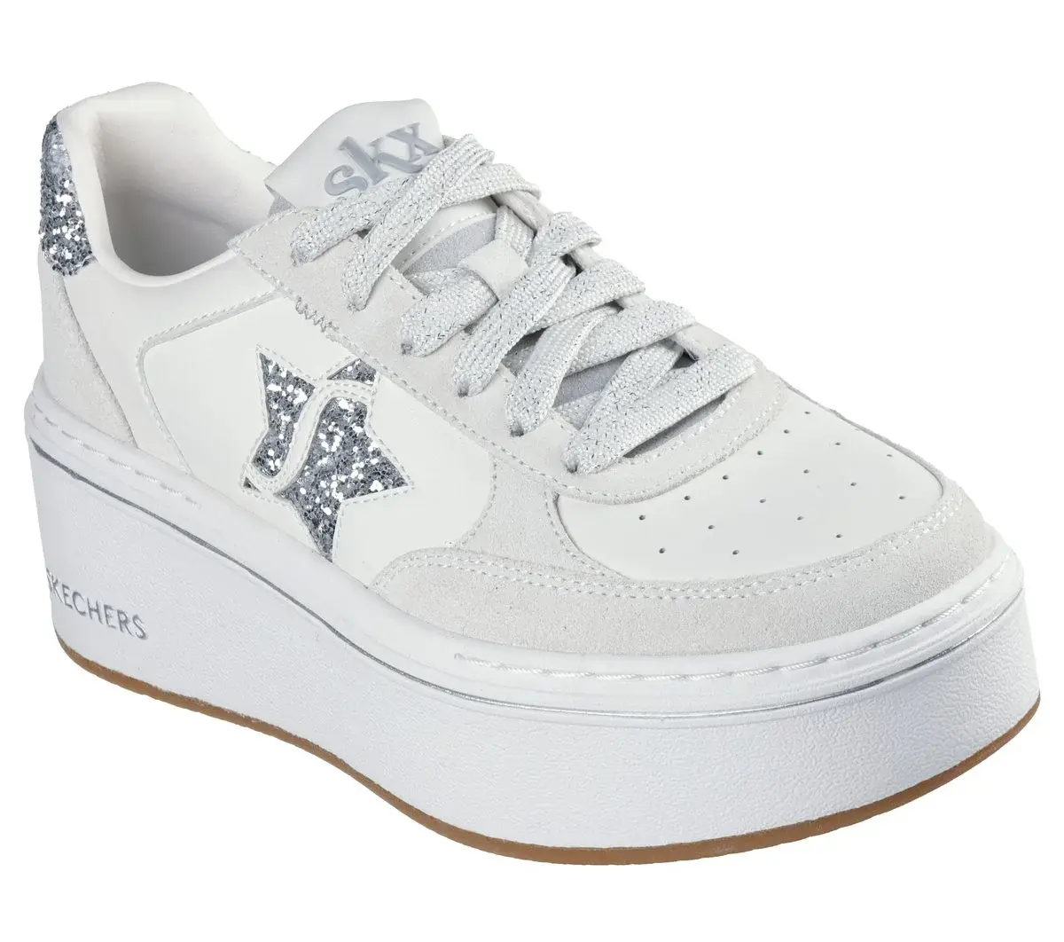 Reach new heights of style with Skechers Paloma – Brightest Star. This lace-up platform court style features a duraleather and genuine suede overlay upper with a glittery star detail and a cushioned Skechers Air-Cooled Memory Foam® comfort insole.