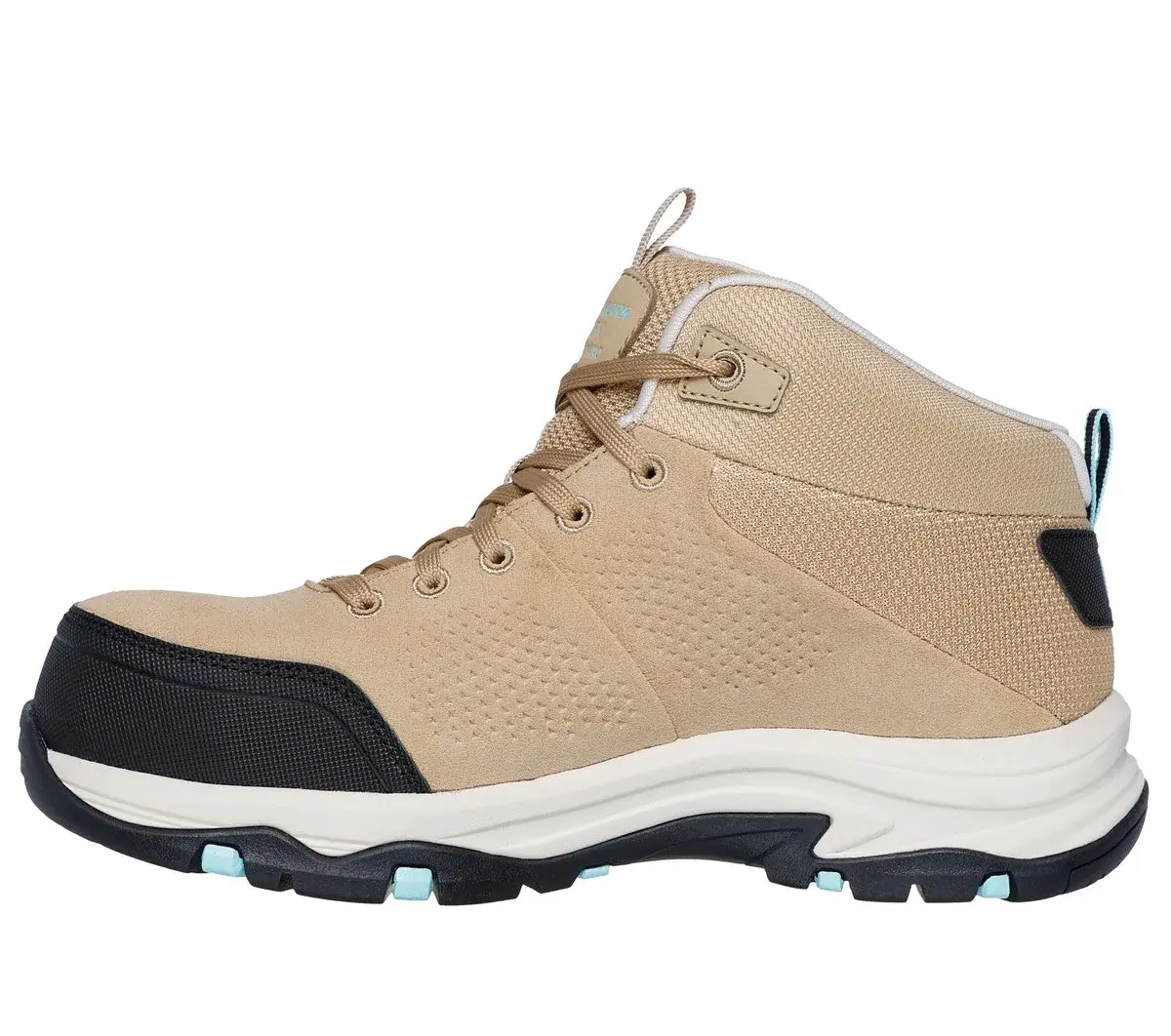 Surefooted comfort and safety deliver in Skechers Work™: Trego. This lace-up hiker inspired design features a waterproof leather, synthetic and woven fabric upper with a cushioned Skechers Air-Cooled Memory Foam® insole and a carbon nano toe.