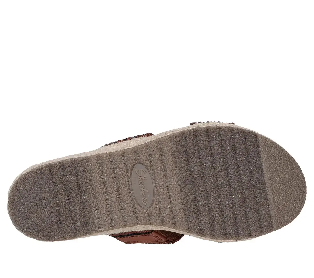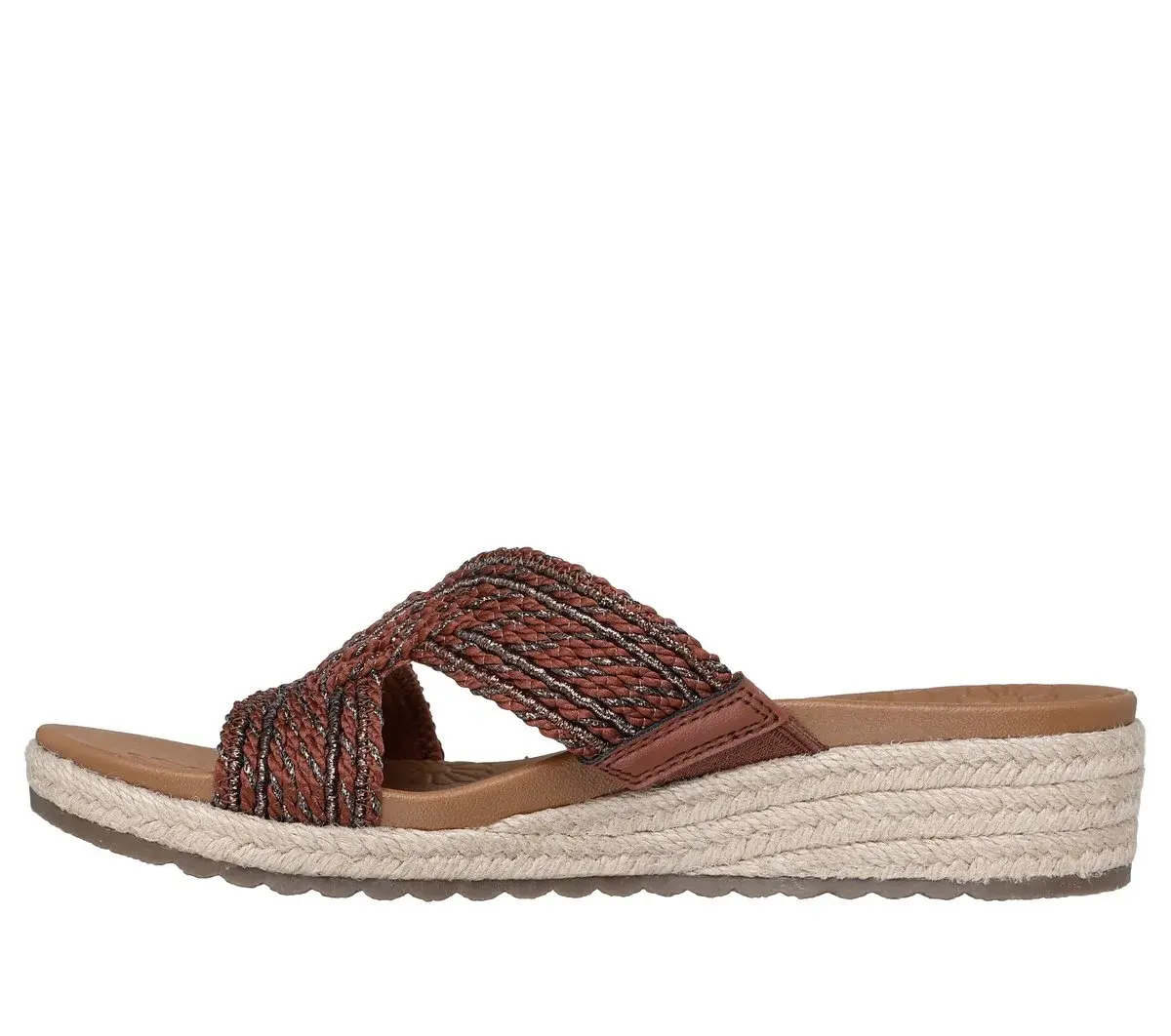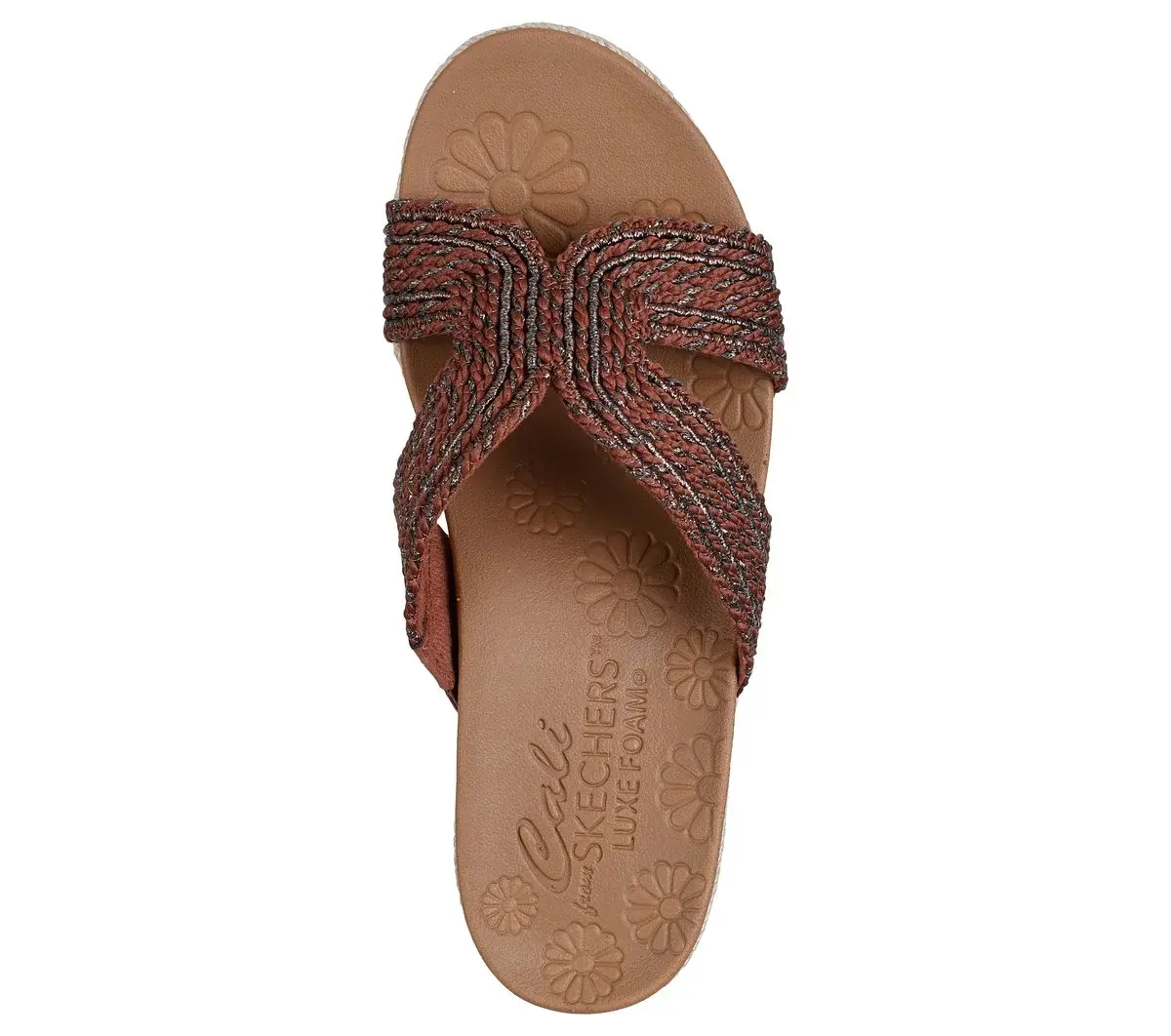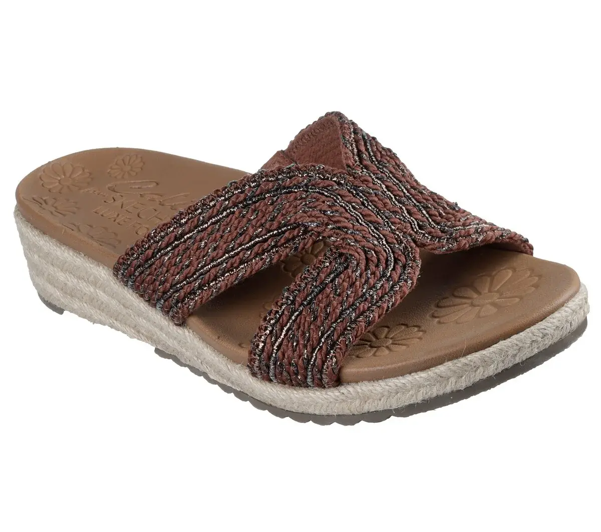 Summery style and top-notch comfort combine in Skechers Cali® Breezie – Shimmer Waves. This vegan wedge sandal features a metallic jute H-band upper, an espadrille midsole with jute trim, and a cushioned Luxe Foam® footbed.