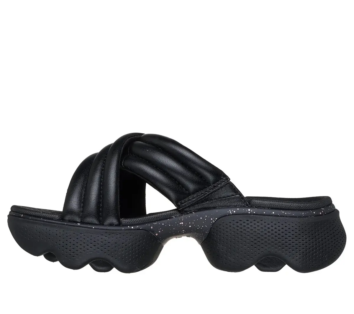 Ease back in standout style and summery comfort with Skechers: Massage Fit Edge – Sky High. This vegan crossband slide sandal features a quilted synthetic leather upper, a contoured Goga Mat® footbed with Arch Comfort® for added support, and a speckled Massage Fit™ midsole that massages your foot with every step.