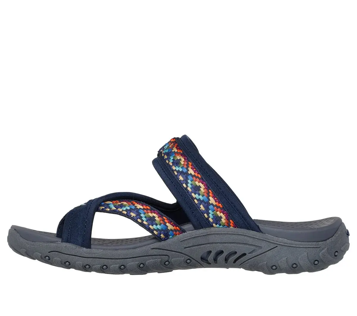Walk the trails in colorful style and comfort with Skechers Reggae – Day-Dreamers. This toe loop sandal features a leather and multicolor web fabric upper with an adjustable strap.