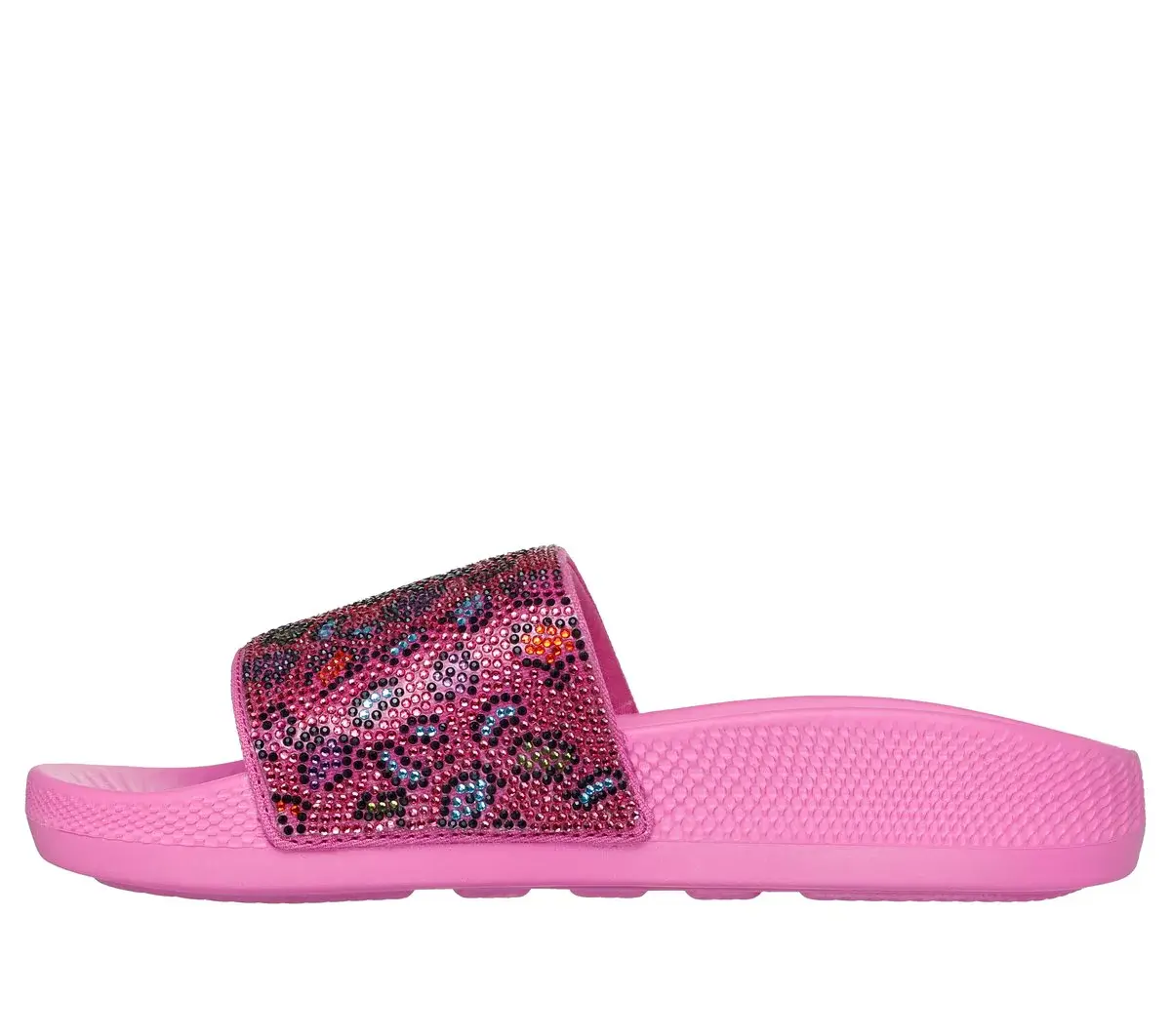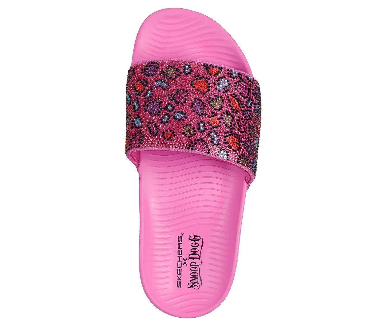 Snoopify your ‘slides-and-socks’ game in the blinged out Skechers x Snoop Dogg: Low Slider – Cheetalicious. Designed in three stand-out colorways, this single crossband slide features a rhinestone covered synthetic upper in a big cat pattern, plus a contoured Luxe Foam® cushioned footbed.