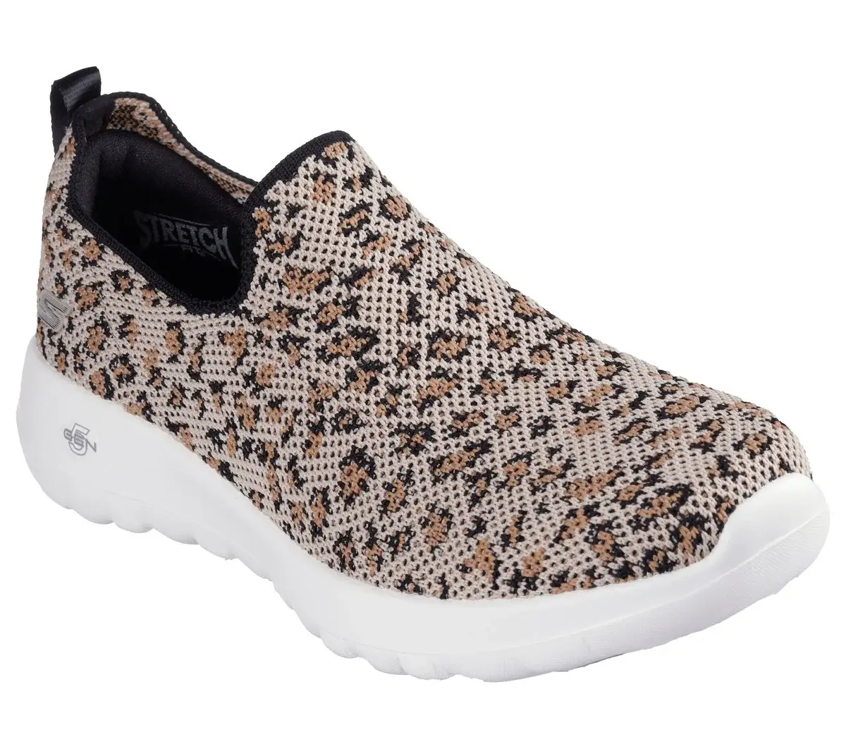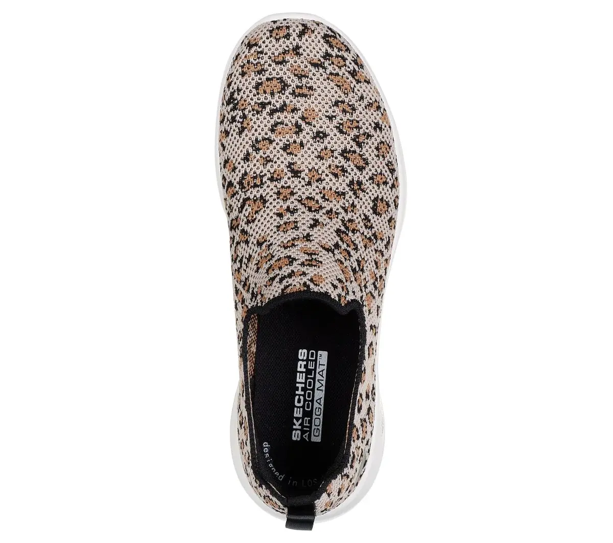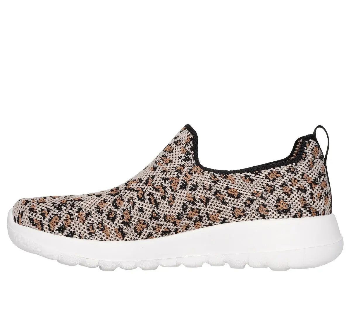 Prowl around town in total comfort wearing Skechers GO WALK Joy™- Mariah. This laceless vegan design features a Stretch Fit® knit mesh upper in a leopard print with lightweight ULTRA GO® midsole cushioning and a Goga Mat™ insole.