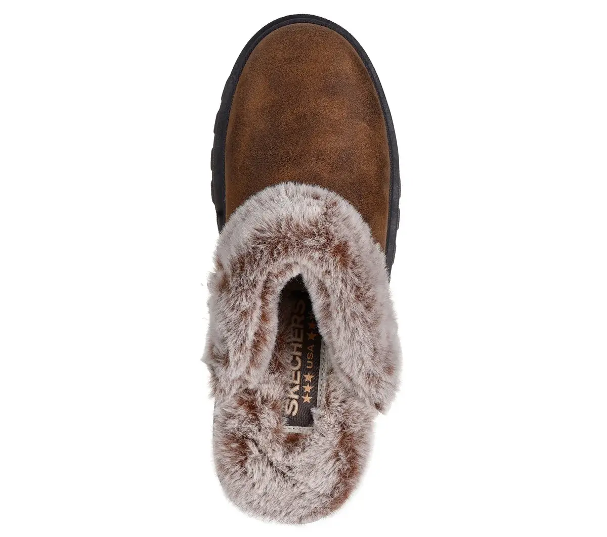 Stay cozy and comfortable all season in Skechers Shindigs – Comfyy! This vegan open-back clog design features a distressed leather-look textile upper with faux-fur trim and lining, platform midsole, and a cushioned Skechers Memory Foam™ insole.